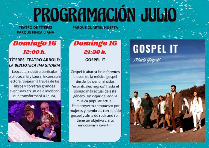 También el domingo 16, el grupo malagueño Gospel It ofrece un concierto, a las 21:30 h, en el Parque Cuartel Huerta, en el que recorrerá diferentes etapas de la música góspel, desde los denominados "espirituales negros" hasta el sonido más actual de este género, sin dejar de lado la música popular actual.