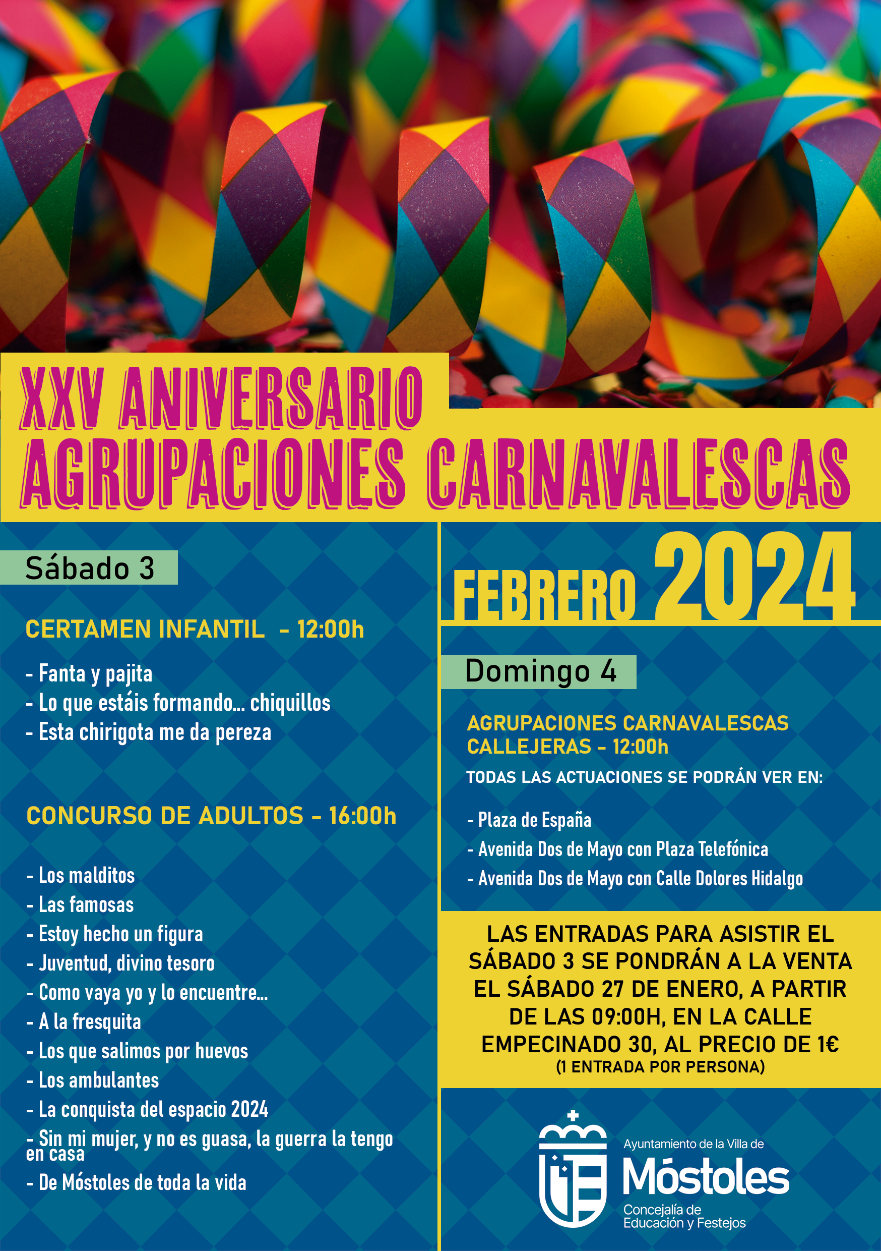- El sábado 3 de febrero tendrán lugar el XXV Concurso de Agrupaciones Carnavalescas y el Certamen infantil, en el Teatro Villa de Móstoles.