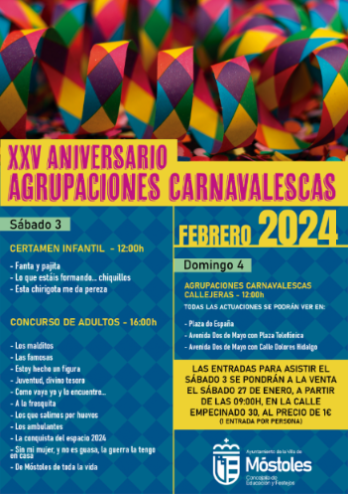 Además, la celebración de la XXVedición del Concurso de Agrupaciones Carnavalescas tendrá lugar el sábado día 3 de febrero, en el Teatro Villa de Móstoles, a partir de las 16:00 horas, y en el que participarán un total de 11 agrupaciones de adultos, interpretando: "Los malditos", "Las famosas", "Estoy hecho un figura", "Juventud divino tesoro", "Como vaya yo y lo encuentre…", "A la fresquita", "Los que salimos por huevos", "Los ambulantes", "La conquista del espacio 2024", "Sin mi mujer, y no es guasa, la guerra la tengo en casa", "De Móstoles de toda la vida", desplegarán todo su humor y su ingenio para traer letras divertidas en sus actuaciones. Este concurso, para mayores de 16 años, está dotado con un primer premio de 800 euros, un segundo premio de 650 euros y un tercer premio dotado con 500 euros.