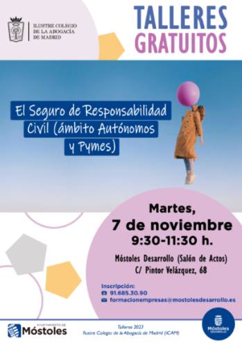 Cartel Responsabilidad civilCartel Responsabilidad civilCon el objetivo de apoyar a emprendedores, autónomos y pymes de la ciudad, el Ayuntamiento de Móstoles, a través de Móstoles Desarrollo, ofrece durante el último cuatrimestre de 2023 varios talleres gratuitos, dos de ellos serán impartidos por el Ilustre Colegio de la Abogacía de Madrid.
