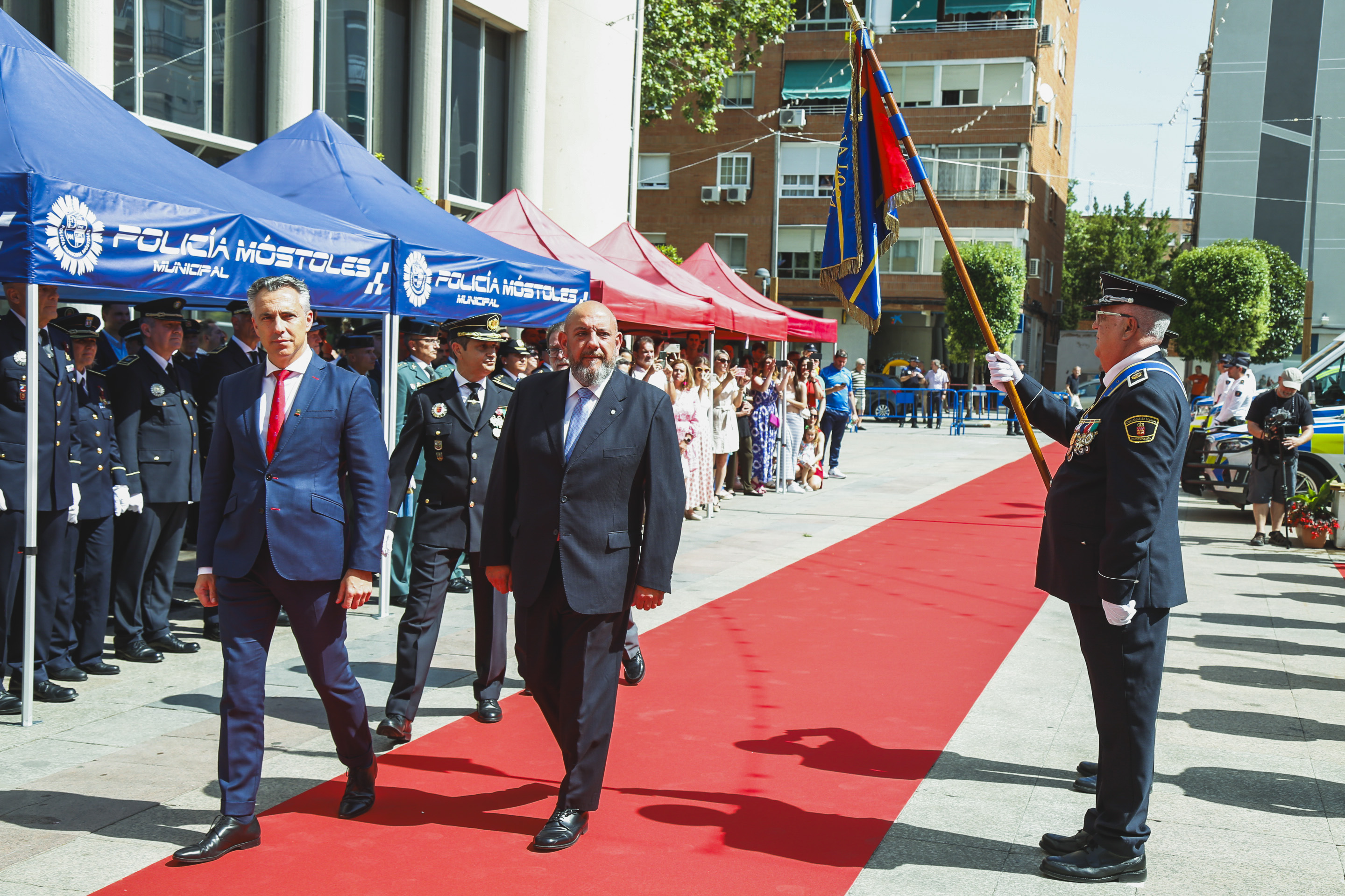 El acto comenzó en la Plaza de la Cultura, con el izado de bandera al son del himno nacional, tras pasar revista a las Unidades de la Policía Municipal, que componen el Cuerpo de Policía Municipal de Móstoles, como son las Unidades Integrales del Área de Mediación y Seguridad Ciudadana, la Unidad Especial de Tráfico, la Unidad de Policía Judicial e Investigación de Accidentes, la Unidad Canina o la Unidad contra el Maltrato Animal y Protección del Medioambiente.