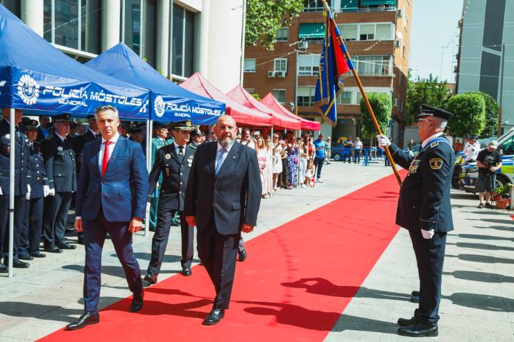 Participaron en este acto solemne el alcalde de Móstoles, Manuel Bautista, el primer teniente de alcalde y concejal de Seguridad, Emergencias y Medio Ambiente, Gabriel Monteserín, y el consejero de Medio Ambiente, Agricultura e Interior de la Comunidad de Madrid, Carlos Novillo, quien, además, recibió la medalla de la Policía Municipal por el firme compromiso con la seguridad y vocación de servicio en su trayectoria profesional.
