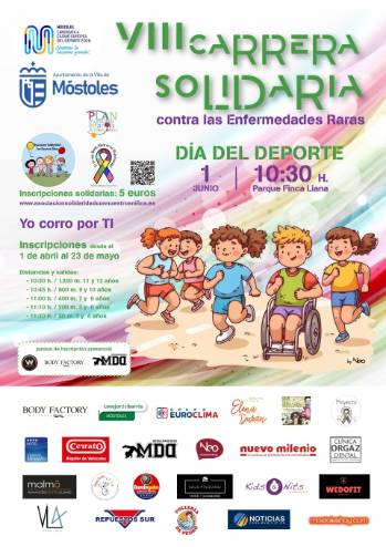 - La VIII Carrera Solidaria Infantil contra las Enfermedades Raras, impulsada por la Asociación Solidaridad con Nuestros Niños, en colaboración con el Ayuntamiento de Móstoles, tendrá lugar el 1 de junio, a partir de las 10:30 h, en Parque Finca Liana.