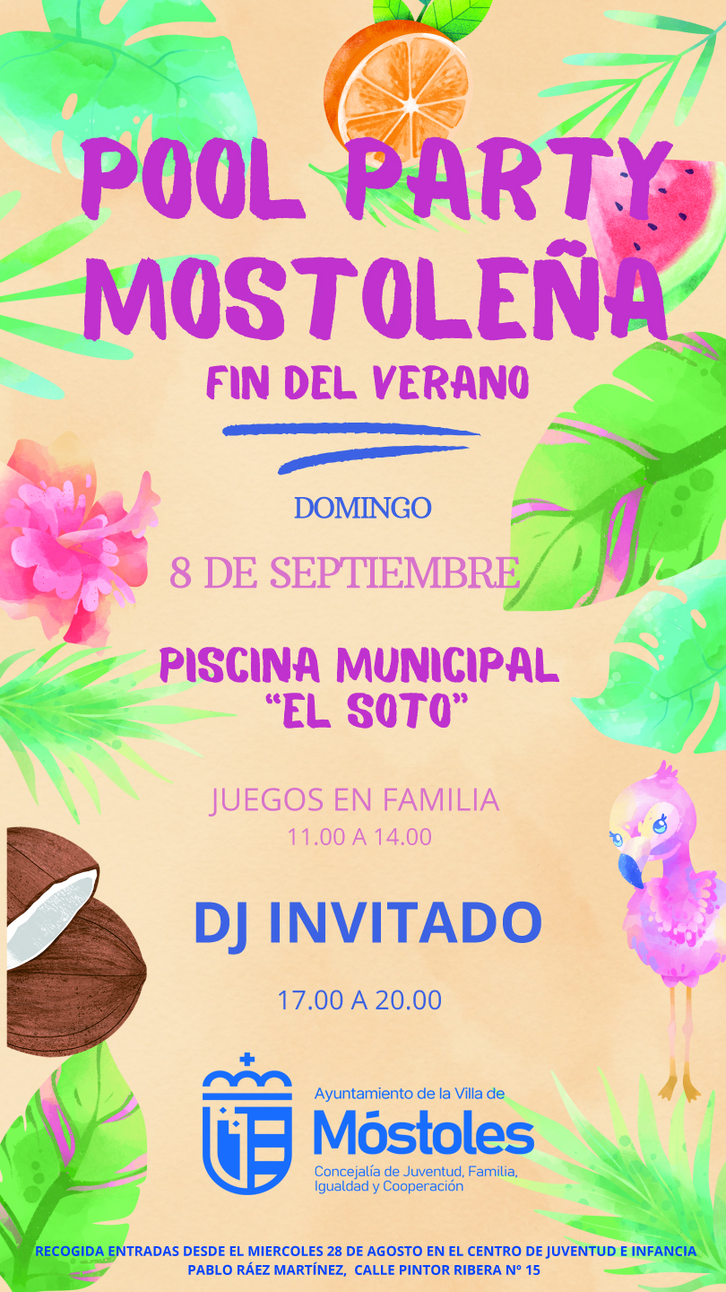 La Pool Party Mostoleña, organizada por el Ayuntamiento de Móstoles a través de la Concejalía de Juventud, Familia, Igualdad y Cooperación, tendrá lugar el domingo 8 de septiembre, de 10:30 h a 20:00 h, en la piscina municipal de El Soto.