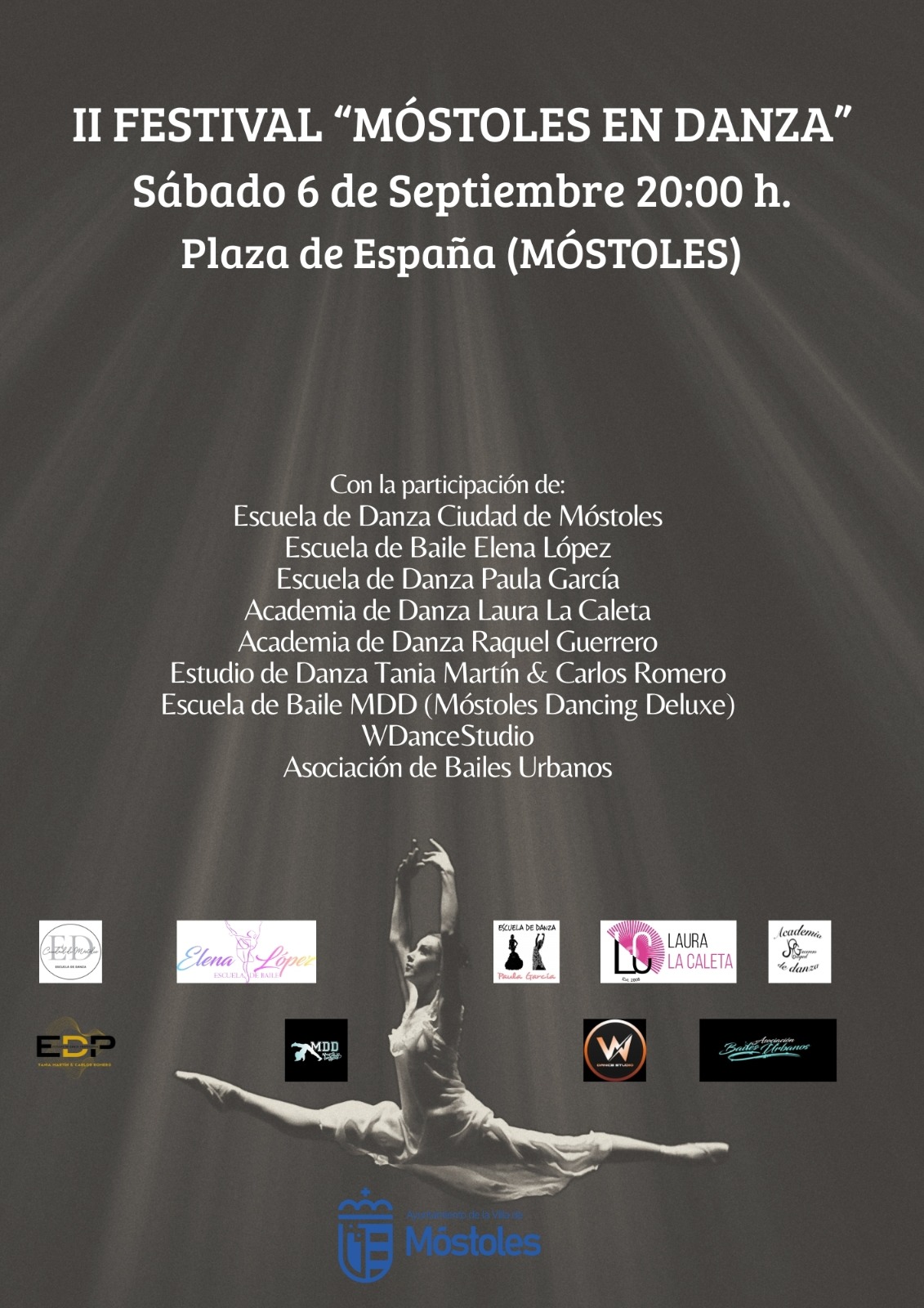 El sábado 6 de septiembre, la Plaza de España se convertirá en el escenario que acogerá el talento de los bailarines que forman parte de distintas escuelas afincadas en el municipio, a partir de las 20:00 h, gracias al II Festival "Móstoles en Danza", para el disfrute de mostoleños y visitantes. Esta cita cuenta con la participación de la Escuela de Danza Ciudad de Móstoles, la Escuela de Baile Elena López, la Escuela de Danza Paula García, la Academia de Danza Laura La Caleta, la Academia de Danza Raquel Guerrero, el Estudio de Danza Tania Martín y Carlos Romero, la Escuela de Baile MDD (Móstoles Dancing Deluxe), WDanceStudio y la Asociación de Bailes Urbanos.