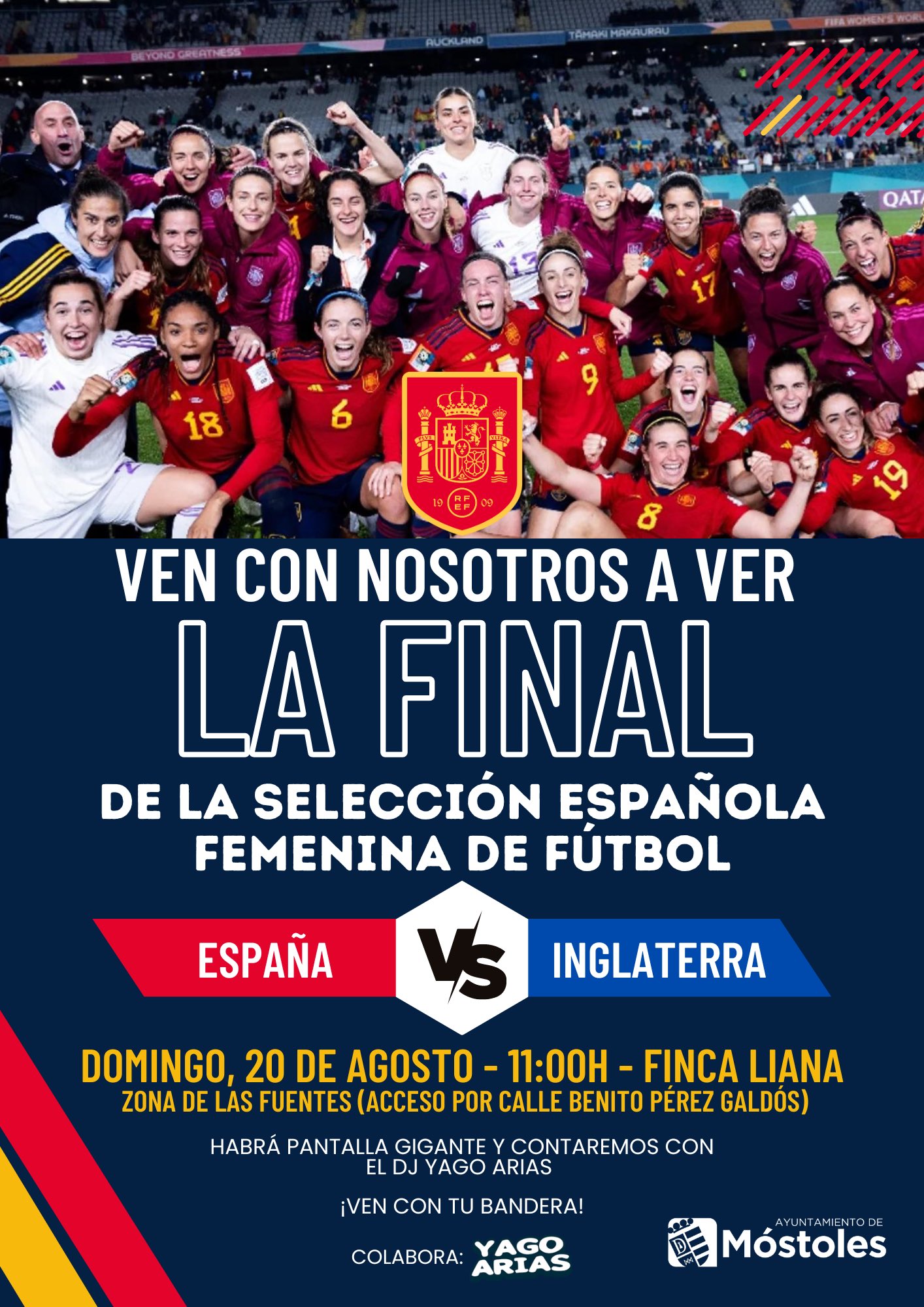 El Ayuntamiento de Móstoles instalará este domingo 20 en Parque Finca Liana una pantalla gigante para que todos los mostoleños puedan seguir y apoyar a la selección española femenina de fútbol durante la final del Campeonato del Mundo que disputará a partir de las 12:00 h ante Inglaterra.