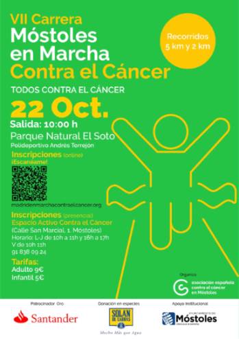 La VII Carrera Móstoles en Marcha contra el Cáncer, que se enmarca en el proyecto "Madrid en Marcha Contra el Cáncer", tendrá un aforo máximo de 1500 corredores para los dos recorridos. Todos los interesados podrán inscribirse a través de la web www.madridenmarchacontraelcancer.orgEste enlace se abrirá en una ventana nueva o presencialmente en el Espacio Activo Contra el Cáncer, situado en la calle San Marcial 1, Móstoles, en horario de lunes a jueves, de 10:00 h a 11:00 h y de 16:00 h a 17:00 h, y los viernes, de 10:00 h a 11:00 h. El precio de inscripción es de 9 euros para los adultos y de 5 euros el público infantil.