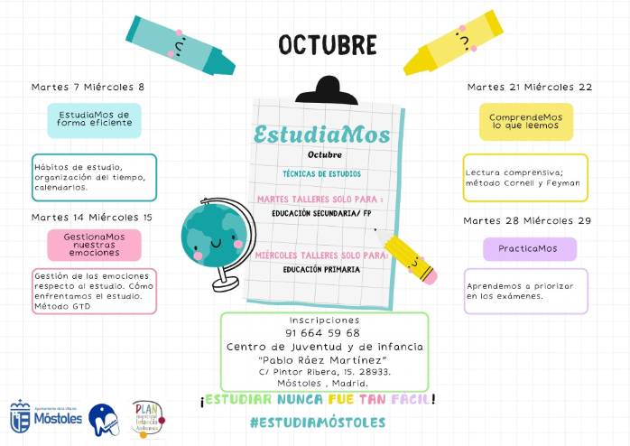 Con motivo del inicio escolar y con el objetivo de apoyar a los estudiantes de Primaria, Secundaria y Formación Profesional, en el marco del Plan Local de Infancia y Adolescencia, desde la Concejalía de Juventud, Familia, Igualdad y Cooperación, el Ayuntamiento de Móstoles pone en marcha este mes de octubre cursos gratuitos sobre técnicas de estudio.