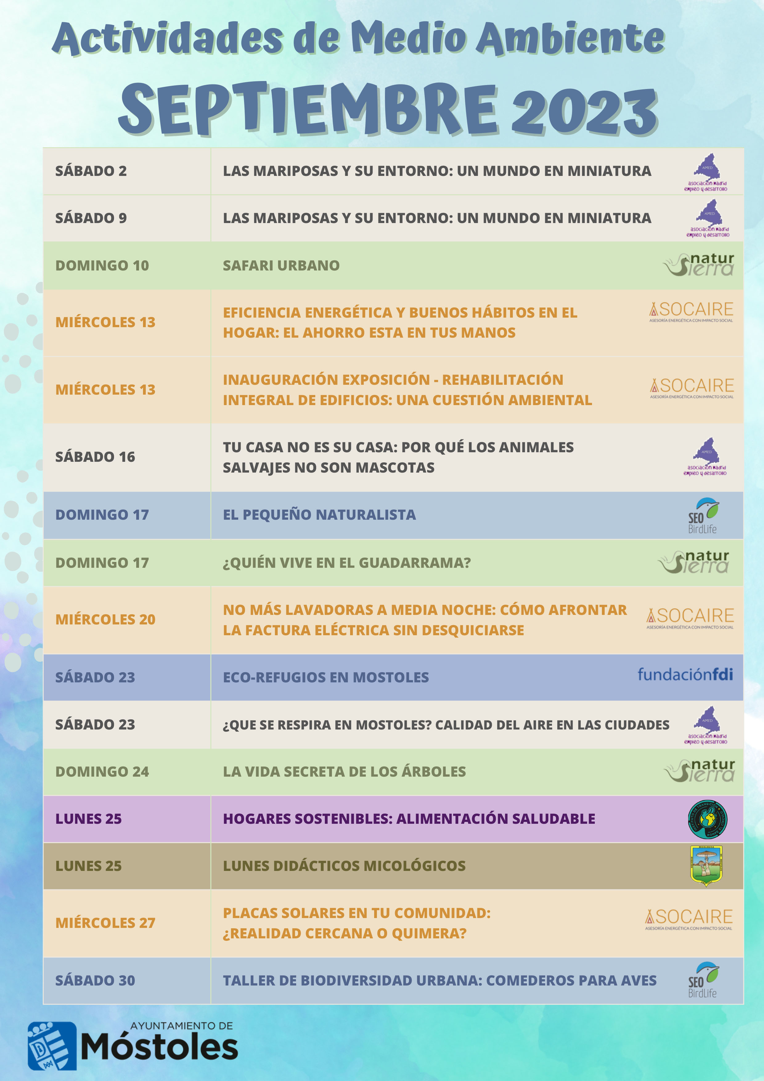 El Ayuntamiento de Móstoles, a través de la Concejalía de Seguridad, Emergencia, Movilidad y Medio Ambiente, ofrece este mes de septiembre más de quince actividades y talleres para sensibilizar y concienciar sobre el cuidado y protección del medioambiente.