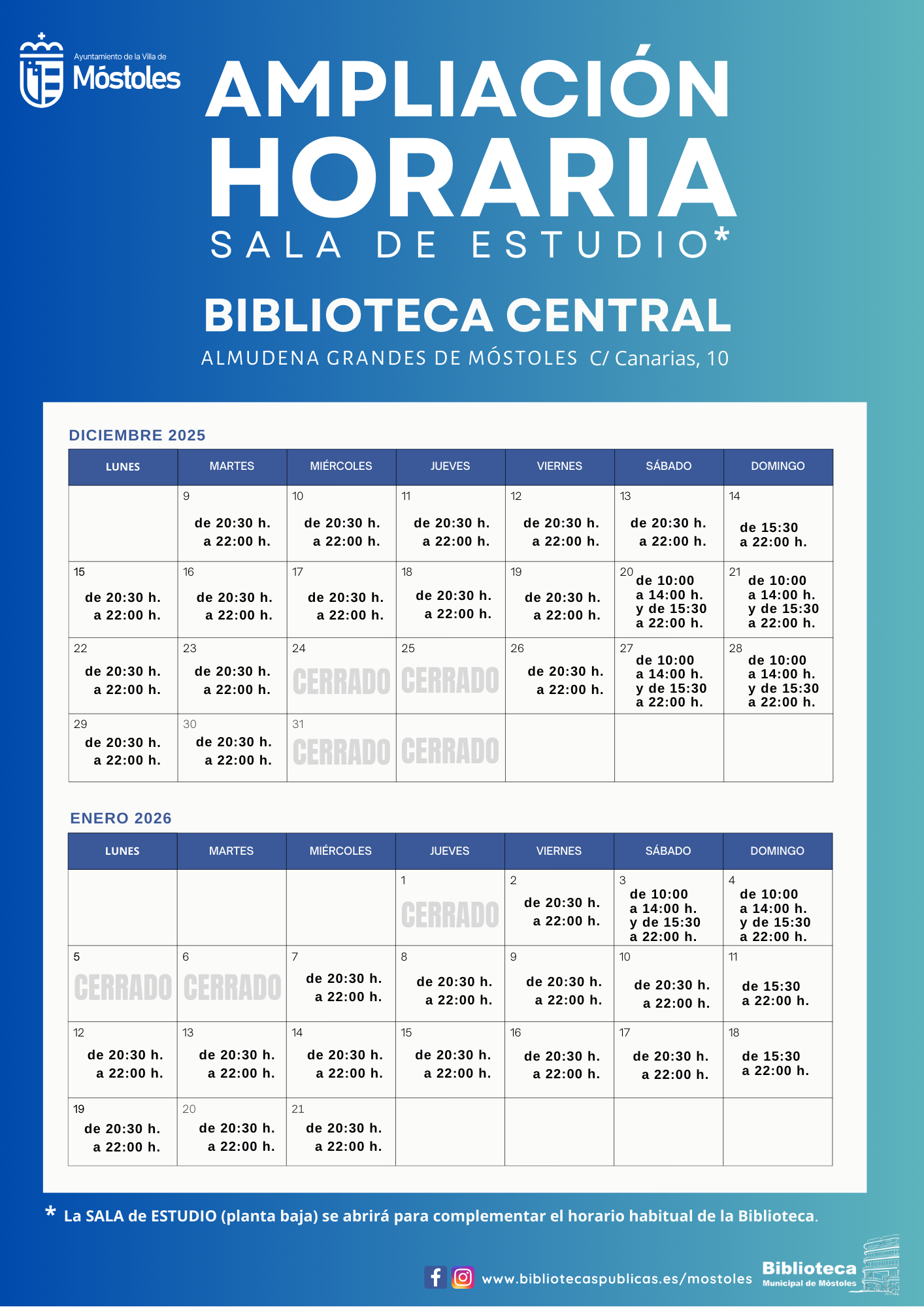 Para una información más detallada de la ampliación horaria de estos espacios, acceder a www.bibliotecaspublicas.es/mostoles/Conocenos/Localizacion-Horarios.html