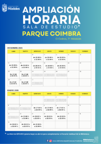 El Ayuntamiento de Móstoles, a través de la Concejalía de Cultura, Desarrollo y Promoción Turística, ofrecerá un horario ampliado de las salas de estudio de la Biblioteca Central y de la biblioteca de Parque Coimbra para facilitar el estudio durante el período de exámenes.