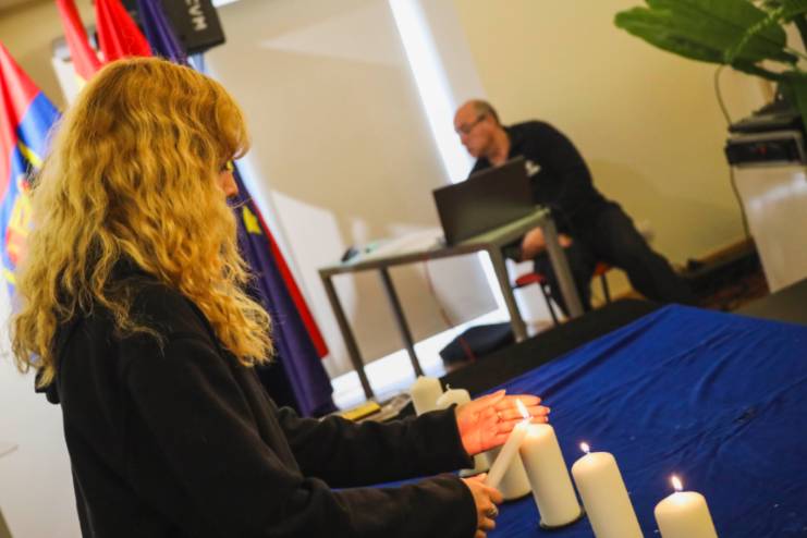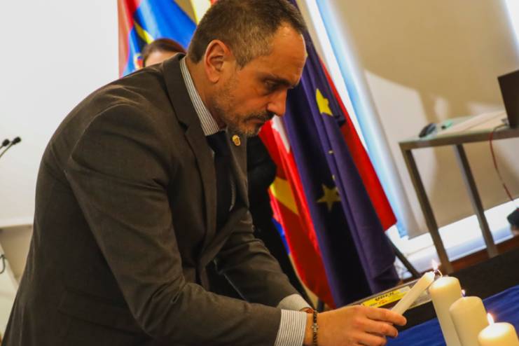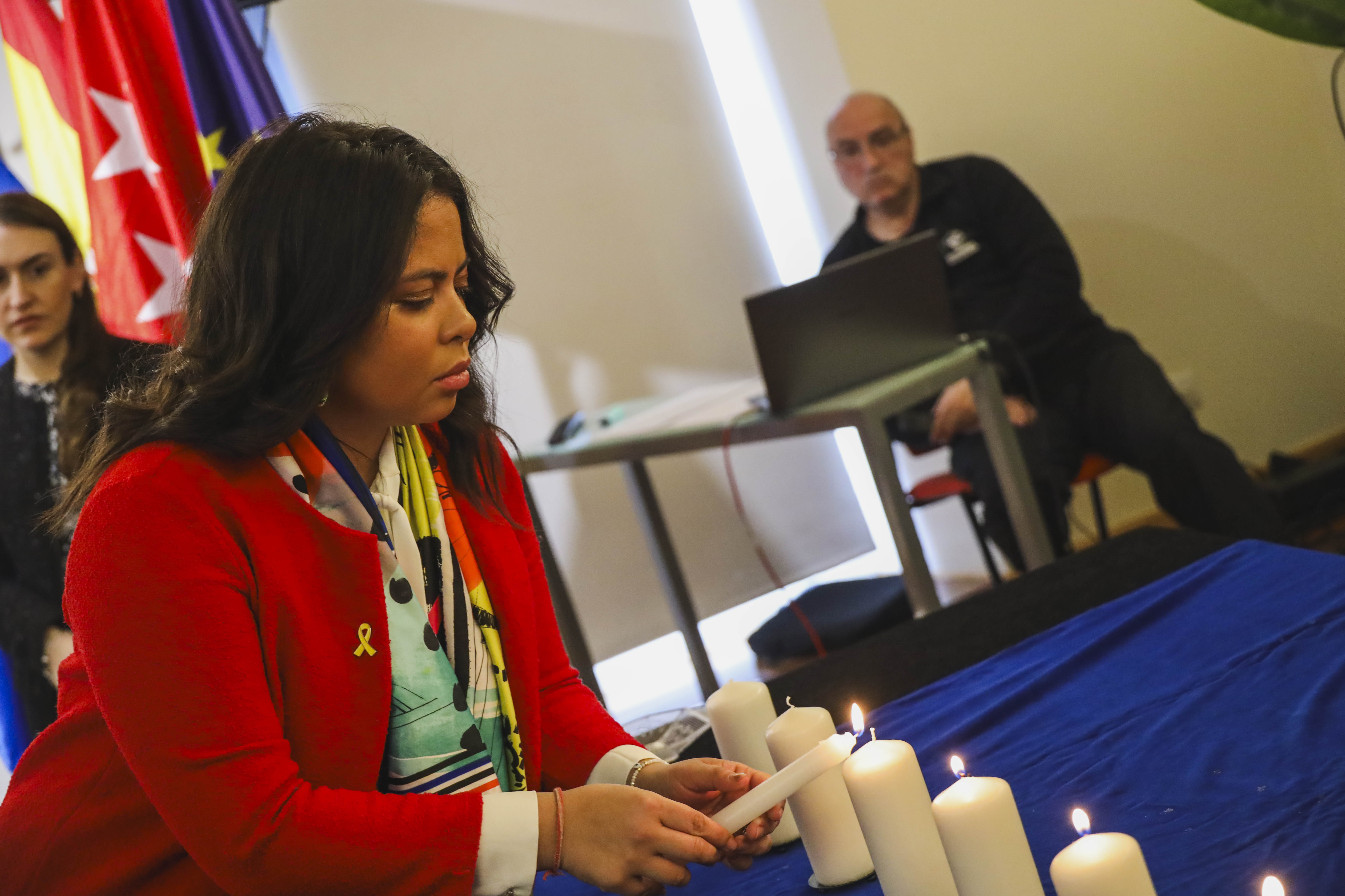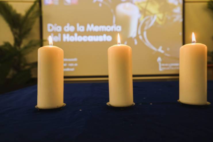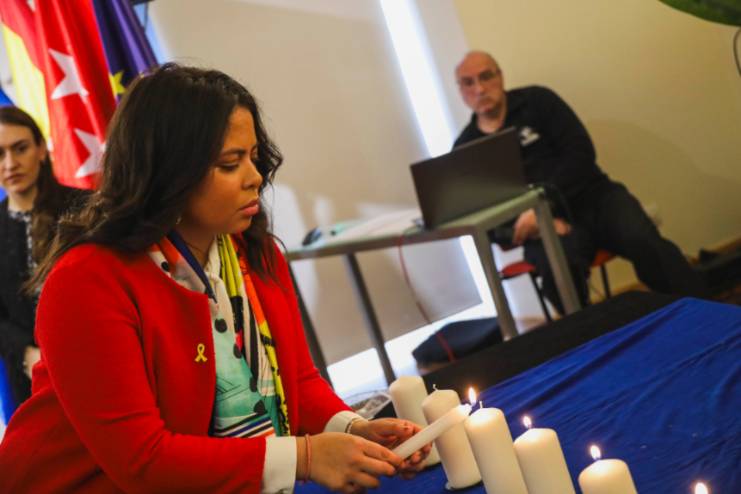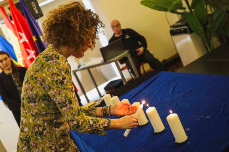 Posteriormente, se procedió al encendido de seis velas en Memoria del Holocausto, en el que se ha contado con la interpretación musical de miembros del Conservatorio Municipal Rodolfo Halffter de Móstoles. En la tercera vela, se contó con el acompañamiento de un alumno del IES Rayuela, de 1º de Bachillerato, con el objetivo de crear conciencia entre los más jóvenes para evitar que en el futuro estos hechos se vuelvan a repetir.
