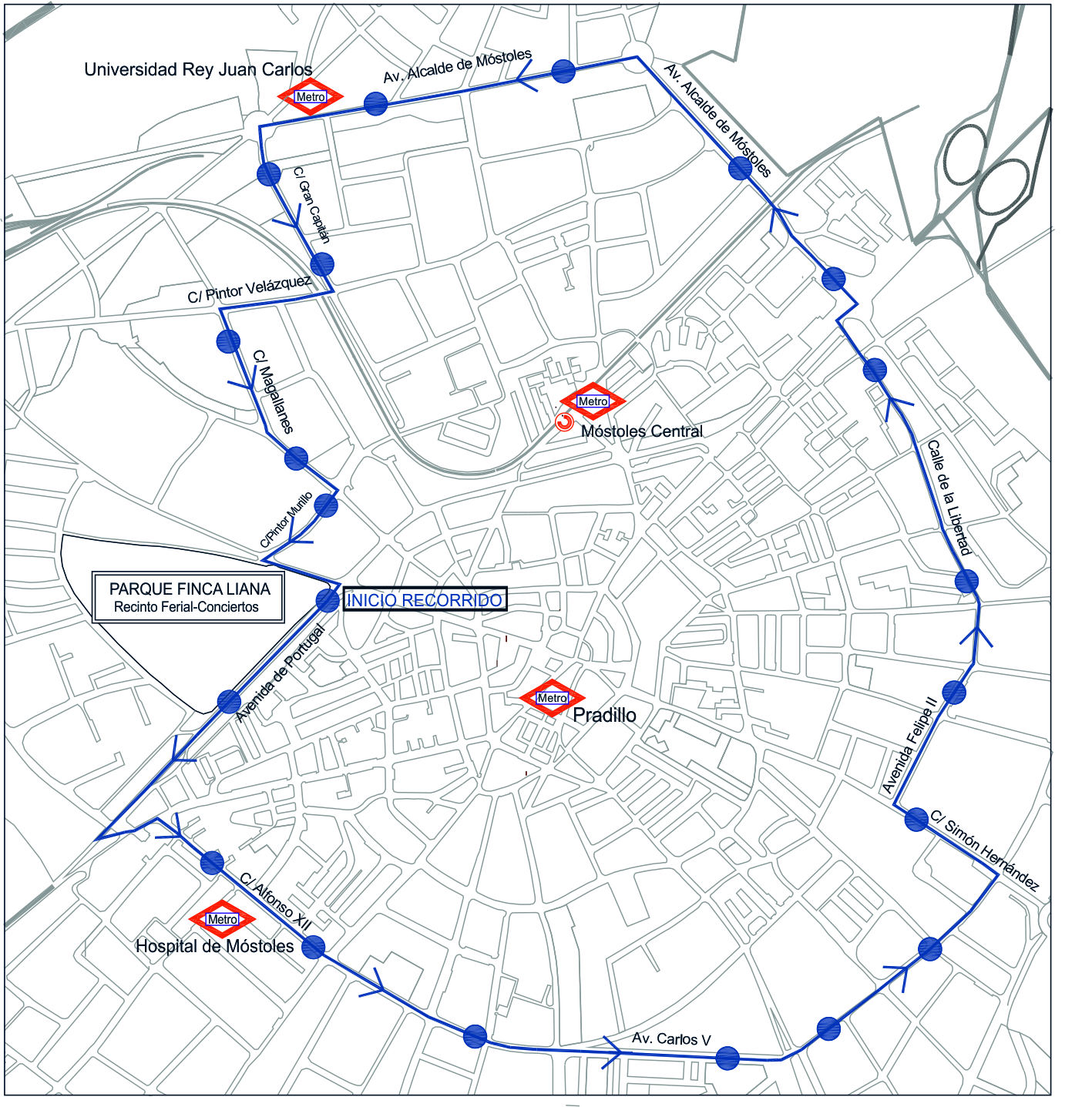 - Móstoles Centro, con salidas desde Avd. de Portugal, junto a Parque Finca Liana: 1:30 h., 2:15 h., 3:15 h. y 4:15 h. Este horario se aplicará las noches de los días 11, 12, 15 y 16. El jueves 14 será a la 1:30 h. y a las 2:15 h.