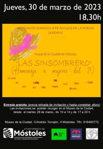 El jueves 30 el Museo de la Ciudad acoge a las 18:30 h el recital de poesía "Homenaje a las sin sombrero", en recuerdo de las mujeres artistas y rebeldes de la Generación del 27 e interpretado por la Asociación Española Amigos de la Poesía (ASEAPO).