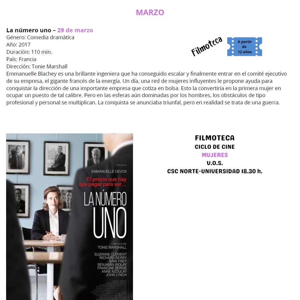 La agenda cultural de Móstoles, organizada por la Concejalía de Seguridad, Convivencia, Cultura y Transición Ecológica, arranca el miércoles 29 con cine en versión original protagonizado por mujeres. Ese día, dentro del programa "Filmoteca", se proyecta a las 18:30 h en el Centro Sociocultural Norte-Universidad la película "La número uno".