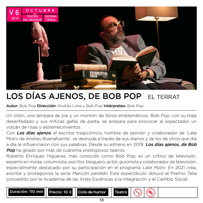 El viernes 6 a las 20:00 h Bob Pop se sube al escenario del Teatro del Bosque para presentar su espectáculo "Los días ajenos". El escritor tragicómico, hombre de opinión y colaborador de "Late Motiv" de Andreu Buenafuente, se desnuda a través de sus diarios y de los de otros que día a día le influenciaron con sus palabras.