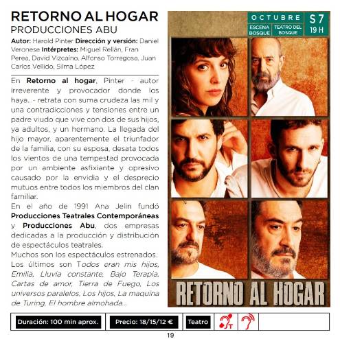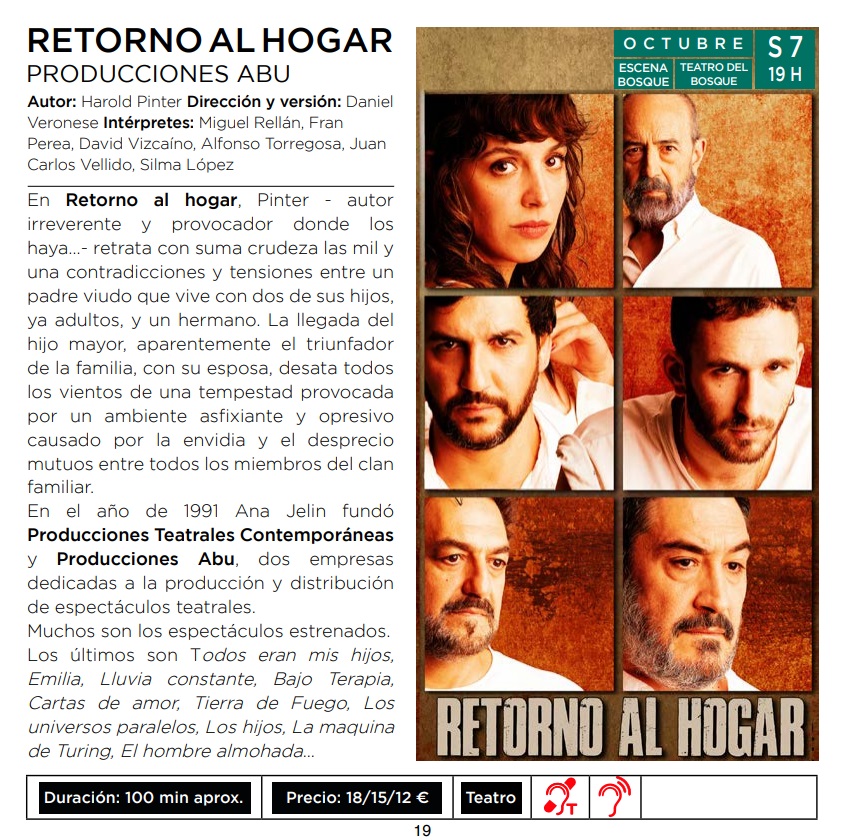 El sábado 7 el Teatro del Bosque será el escenario, a las 19:00 h, de la obra "Retorno al hogar", protagonizada por los actores Miguel Rellán, Fran Perea, David Vizcaíno, Alfonso Torregosa, Juan Carlos Vellido y Silma López.