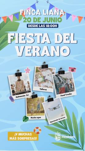 destacada Fiesta de verano Móstoles 2025 copiadestacada Fiesta de verano Móstoles 2025 copiaEl próximo viernes 20 de junio el Parque Finca Liana será el lugar de encuentro y diversión para las familias mostoleñas en la nueva edición de la Fiesta del Verano, organizada por el Ayuntamiento de Móstoles a través de la Concejalía de Educación y Festejos.
