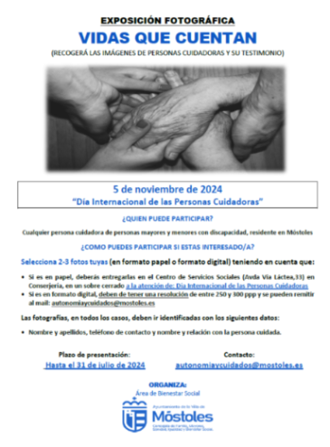 El Ayuntamiento de Móstoles, a través de la Concejalía de Familia, Mayores, Sanidad, Igualdad y Bienestar Social, han organizado la exposición fotográfica "Vidas que cuentan" para dar voz e imagen a las personas que cuidan y atiendan a algún familiar o personas que más lo necesitan. Con motivo del Día Internacional de las Personas Cuidadoras, el 5 de noviembre, ya se está preparando este homenaje en el que todo cuidador del municipio podrá participar.