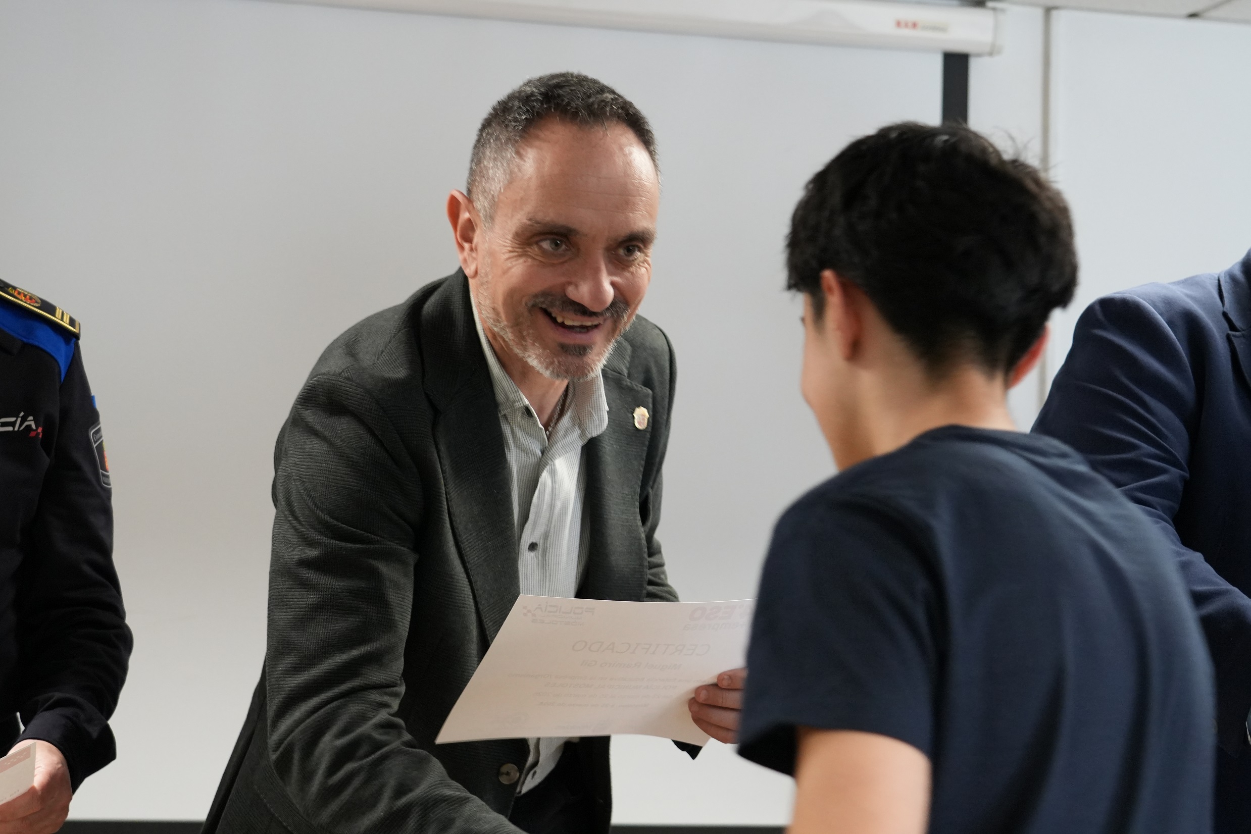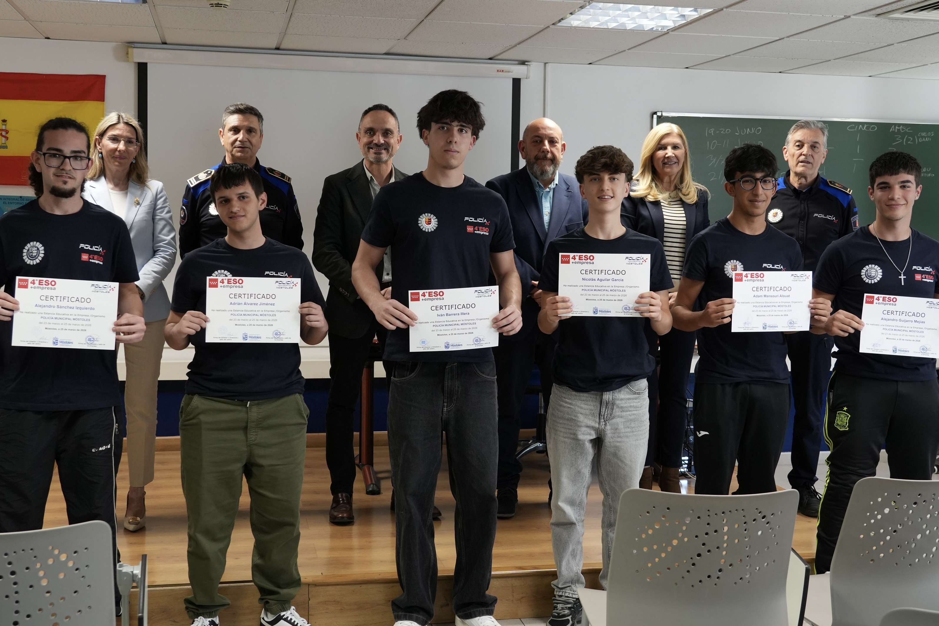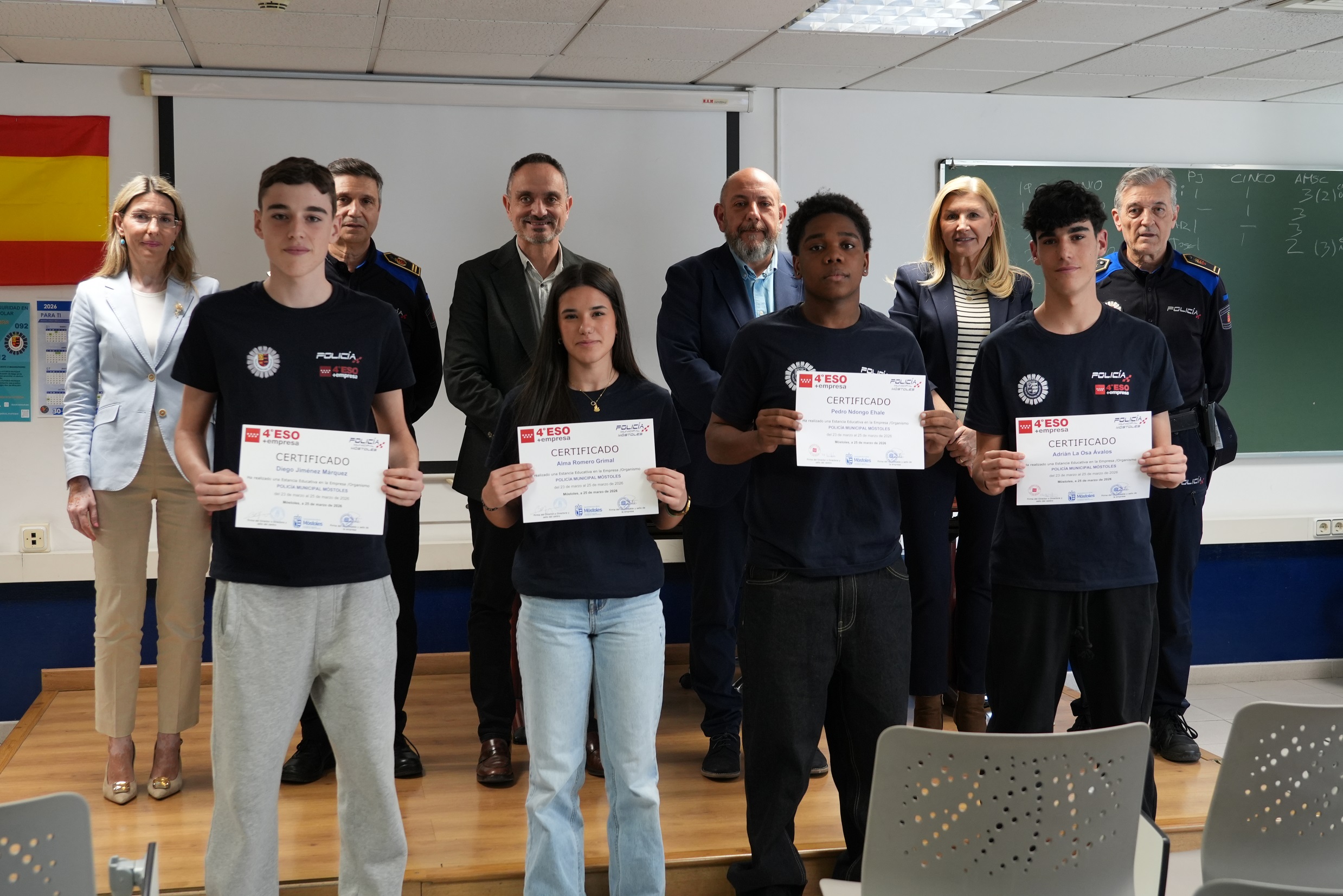 El alcalde de Móstoles, Manuel Bautista, ha participado hoy en la entrega de diplomas a los alumnos participantes en la primera estancia del programa. Al acto han asistido también el primer teniente de alcalde y concejal de Seguridad, Emergencias y Medio Ambiente, Gabriel Monteserín; la concejal de Educación y Festejos, Cristina Molina; y el jefe de la Policía Municipal, Juan Manuel Arribas, entre otros.