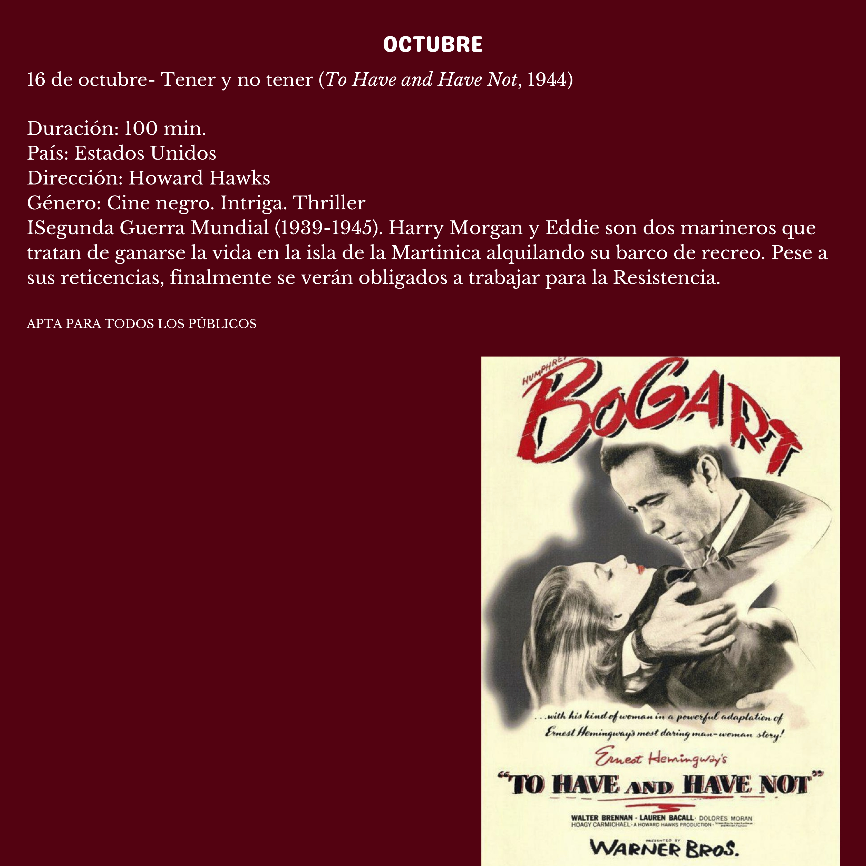 - La película "Tener y no tener" se proyectará hoy a las 18:30 h en el Centro Sociocultural El Soto.