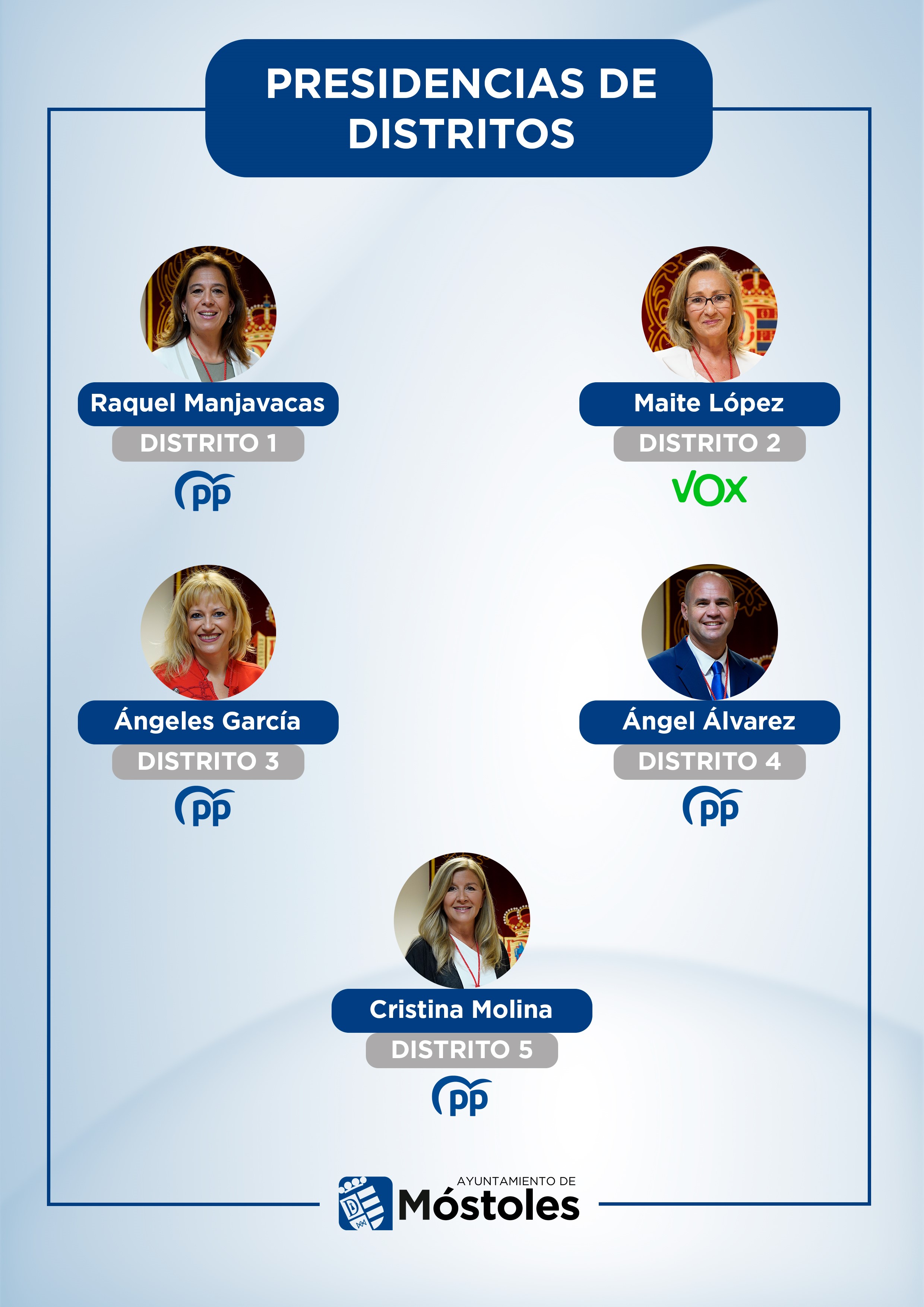 Además, el Alcalde ha nombrado a los presidentes de las Juntas de los cinco distritos. La Junta de Distrito Centro (nº 1) estará presidida por la Concejala de Familia, Mayores, Sanidad, Igualdad y Bienestar Social, Raquel Manjavacas; la Junta de Distrito Norte-Universidad (nº 2), por la Concejala Maite López; la Junta de Distrito Sur-Este (nº 3), por la Concejala de Economía, Industria y Empleo, Ángeles García; la Junta de Distrito Oeste (nº 4), el Concejal de Deportes, Ángel Álvarez; y la Junta de Distrito Coimbra-Guadarrama, por la Concejala de Educación y Festejos, Cristina Molina.