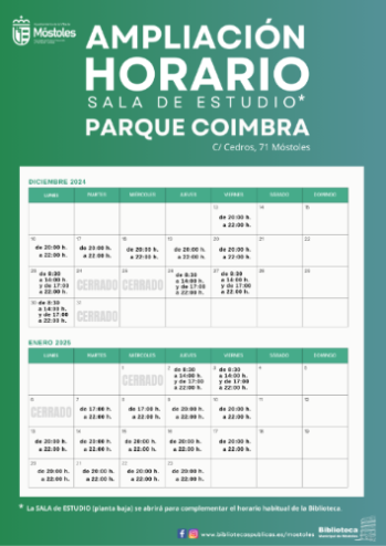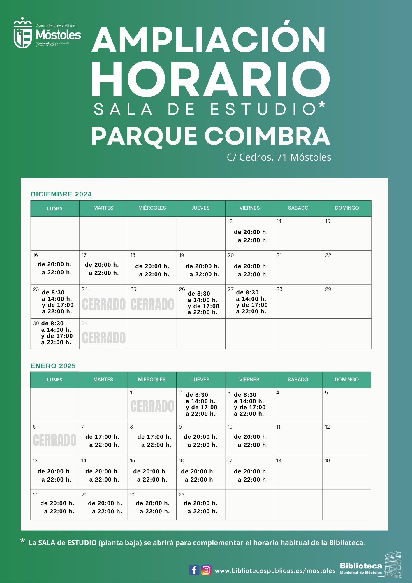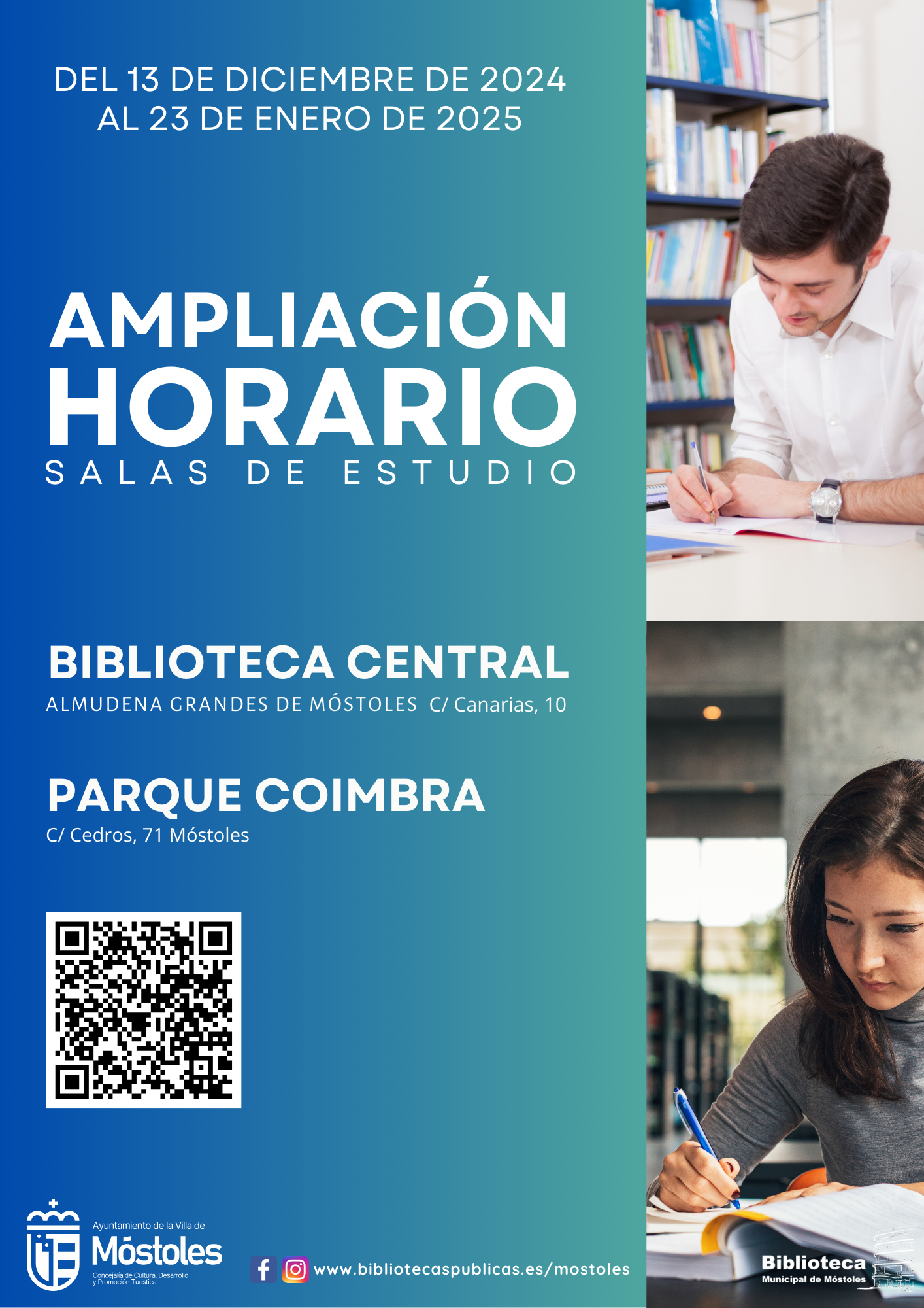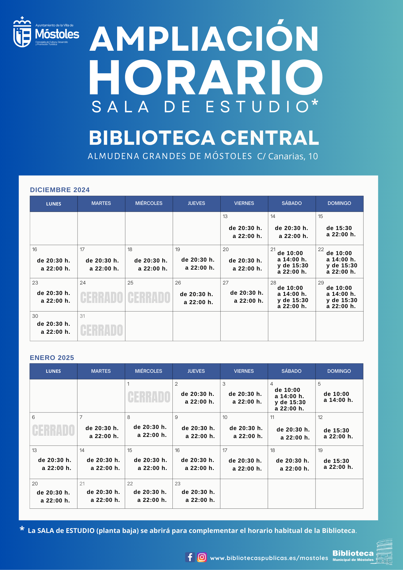 Para una información más detallada de los horarios de ampliación, se puede consultar el siguiente enlace: https://www.bibliotecaspublicas.es/mostoles/Conocenos/Localizacion-Horarios.htmlEste enlace se abrirá en una ventana nueva