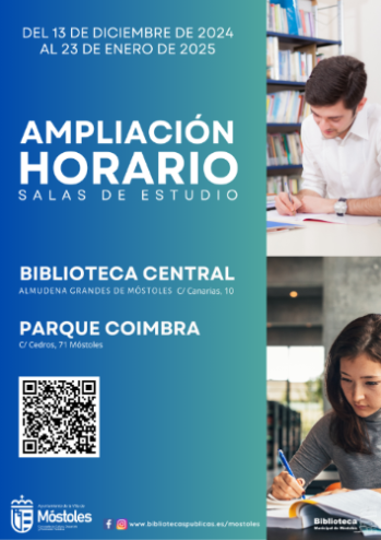 destacada BIBLIOTECA CENTRALdestacada BIBLIOTECA CENTRALPara dar respuesta a la demanda de espacios de estudio por parte de los estudiantes en los períodos de exámenes, el Ayuntamiento de Móstoles, a través de la Concejalía de Cultura, Desarrollo y Promoción Turística, amplía los horarios de las salas de estudio de las bibliotecas Central y Parque Coimbra del 13 de diciembre al 23 de enero.