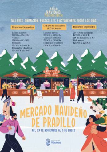 Por otro lado, como cita recomendada para vivir la Magia de la Navidad en Móstoles es la visita al Mercado navideño de Pradillo, instalado en el centro de la ciudad, que permanecerá abierto hasta el 6 de enero, de lunes a jueves de 12:00 h a 22:00 h; los viernes y sábados, de 12:00 h a 00:00 h y los domingos y festivos, de 12:00 h a 23:00 h.