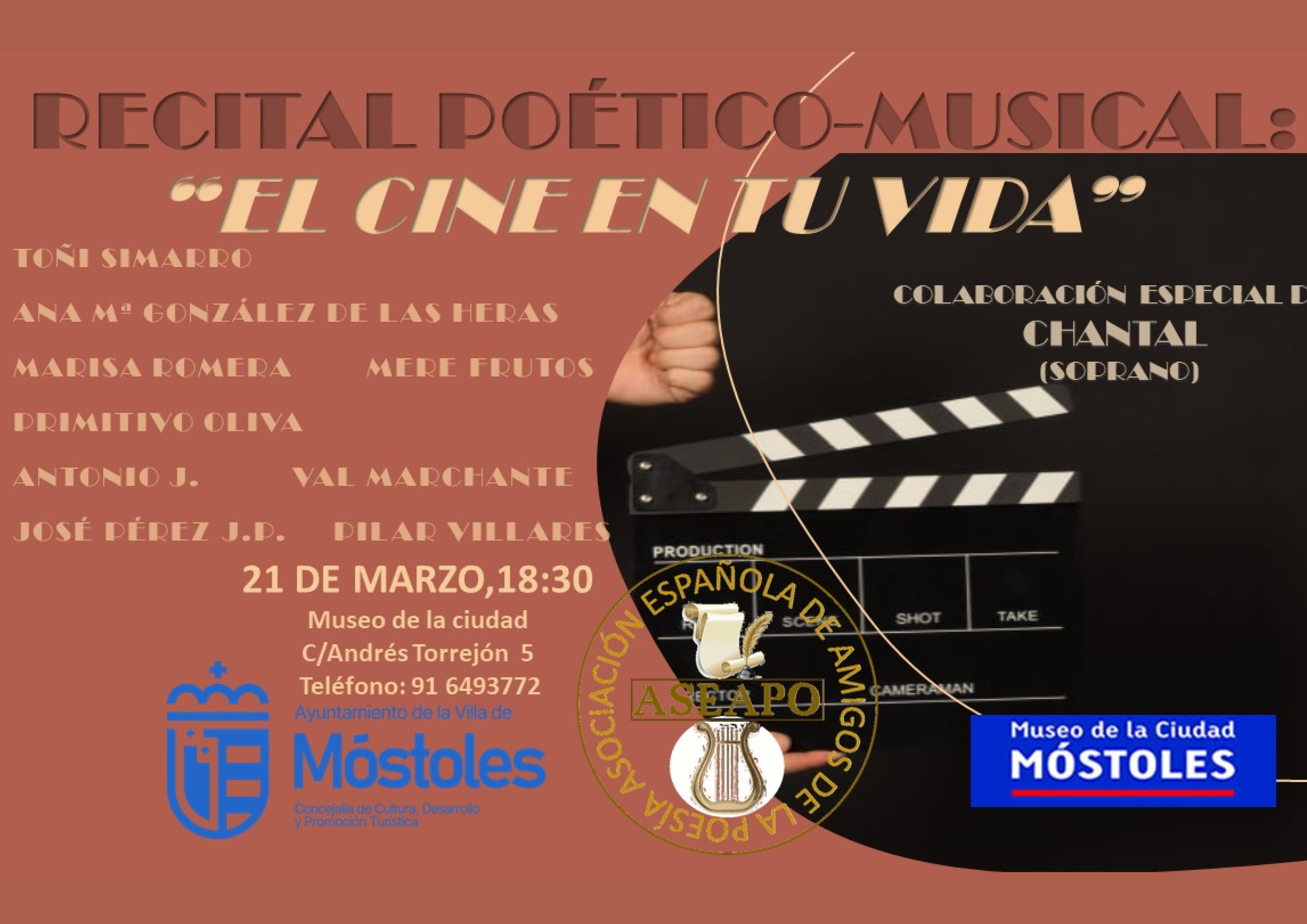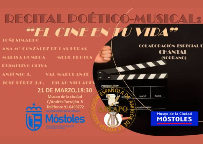 El recital "El cine en tu vida" tendrá lugar en el Museo de la Ciudad a las 18:30 h, con la participación de los poetas Toñi Simarro, Ana González de las Heras, Marisa Romera, Val Marchante, Mere Frutos, Primitivo Oliva, José Pérez y Antonio J. Sánchez.