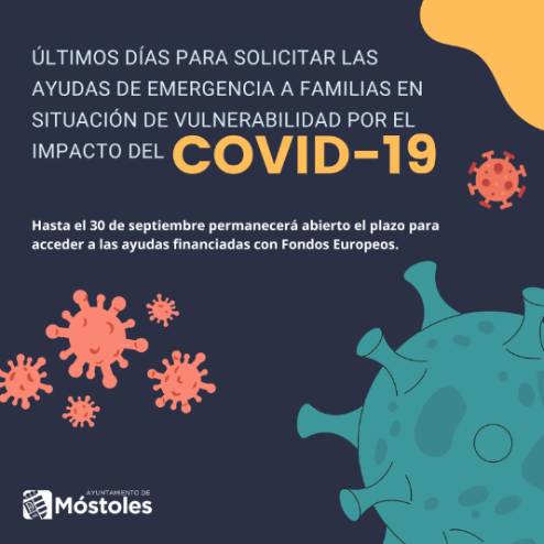 El Ayuntamiento de Móstoles mantiene abierto el plazo de solicitud de ayudas de emergencia a familias en situación de vulnerabilidad a consecuencia del Covid-19. Desde el Área de Bienestar Social de la Concejalía de Familia, Mayores, Sanidad, Igualdad y Bienestar Social, se ha impulsado una línea de ayudas económicas financiadas en su totalidad en el marco de los recursos REACT-UE del Programa Operativo del Fondo Social Europeo de la Comunidad de Madrid 2014-2020, como parte de la respuesta de la Unión a la pandemia del coronavirus.