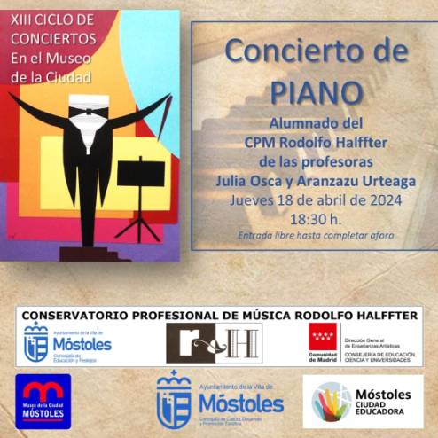 Concierto de piano del alumnado del Conservatorio Profesional de Música Rodolfo Halffter de las profesoras Julia Osca y Aranzazu Urteaga, dentro del XIII Ciclo de Conciertos en el Museo de la Ciudad a las 18:30 horas. Entrada gratuita previa retirada de invitaciones en el propio centro.