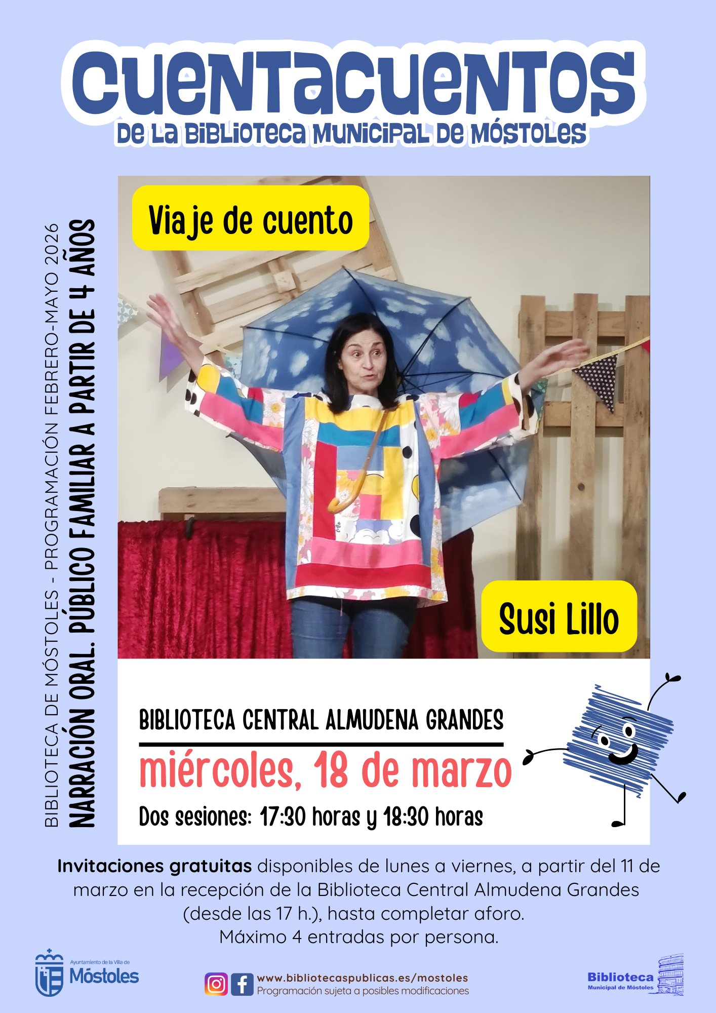 "Viaje de cuento", cuentacuentos a cargo de Susi Lillo, en la Biblioteca Central Almudena Grandes a las 17:30 y 18:30 horas (2 sesiones de 30 minutos). A partir de cuatro años. Entrada gratuita previa retirada de invitaciones en la recepción del propio centro a partir del 11 de marzo desde las 17:00 horas.