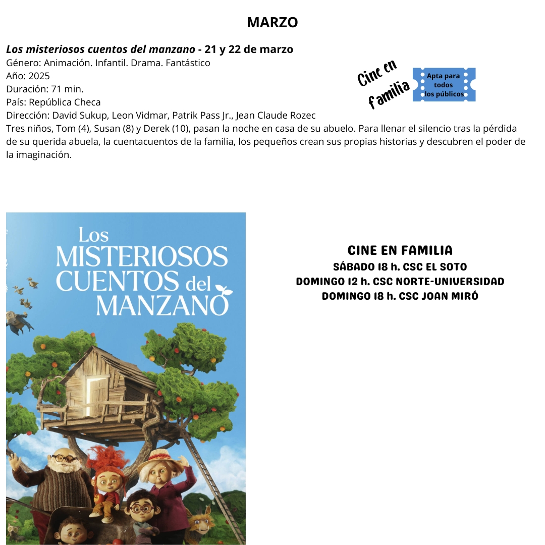 "Los misteriosos cuentos del manzano", proyección gratuita dentro de Cine en familia, en el Centro Sociocultural Norte-Universidad a las 12:00 horas, y en el Centro Sociocultural Joan Miró a las 18:00 horas. Para todos los públicos. Retirada de invitaciones desde el lunes en el propio centro, de 10 a 14 y de 17 a 20 horas.