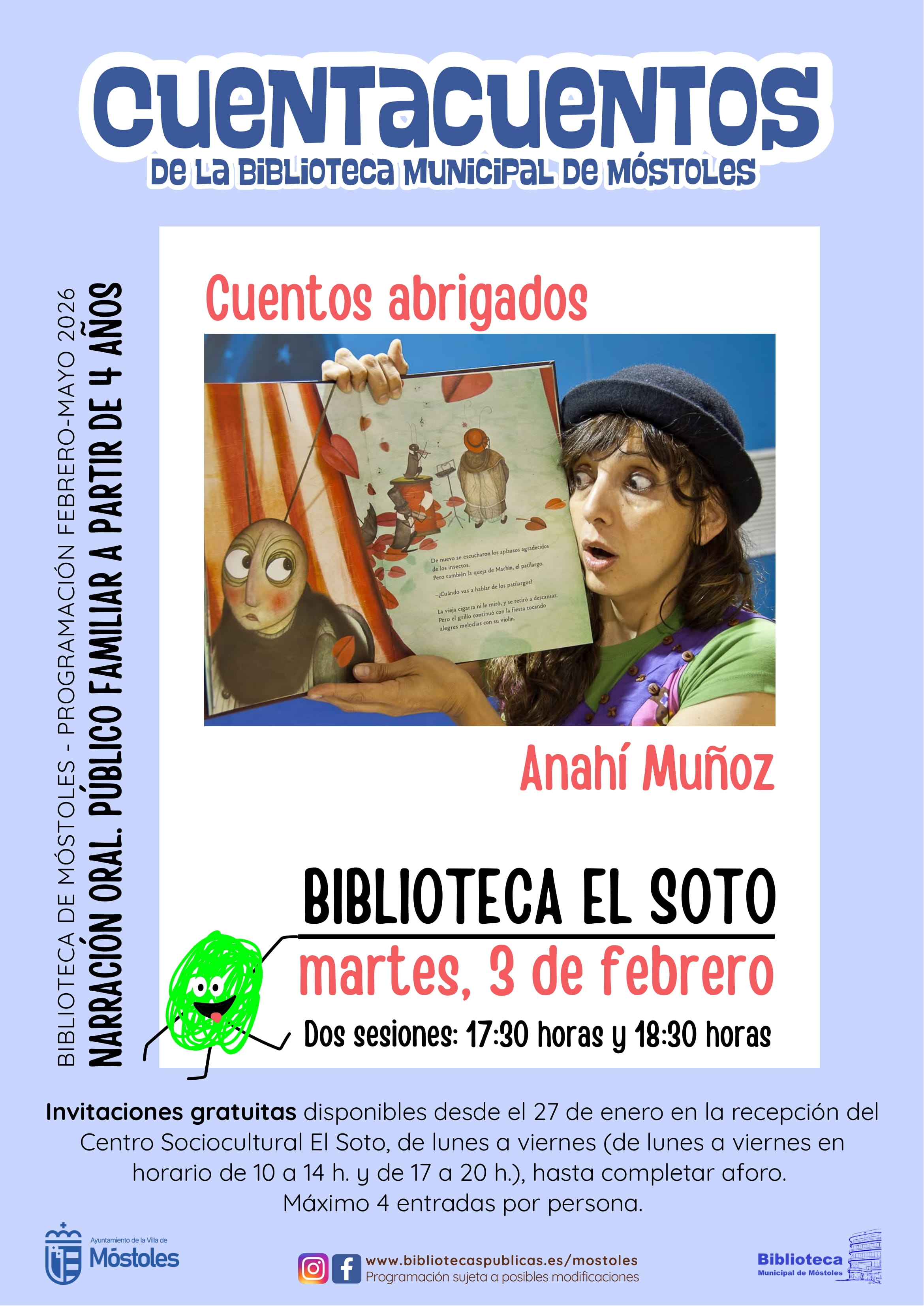 "Cuentos abrigados", cuentacuentos a cargo de Anahí Muñoz, en la Biblioteca del CSC El Soto a las 17:30 y 18:30 horas (2 sesiones de 30 minutos). A partir de cuatro años. Entrada gratuita previa retirada de invitaciones en la recepción del propio centro desde el 27 de enero de 10:00 a 14:00 y de 17:00 a 20:00 horas.