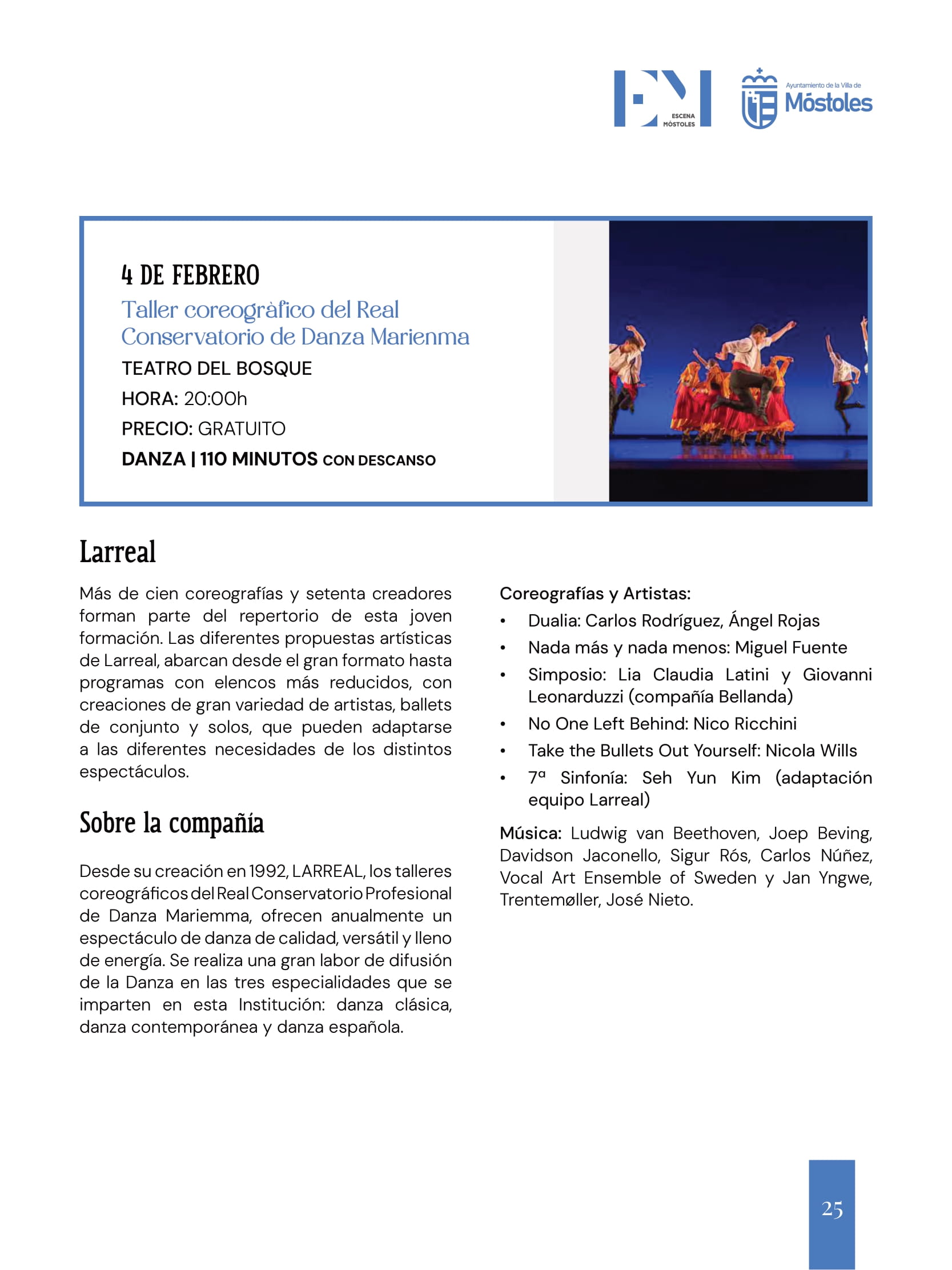 "Taller coreográfico del Real Conservatorio de Danza Marienma", a cargo de la compañía Larreal, en el Teatro del Bosque a las 20:00 horas. Entradas gratuitas. 110 minutos con descanso. Venta de entradas online o en taquillas de los teatros municipales.