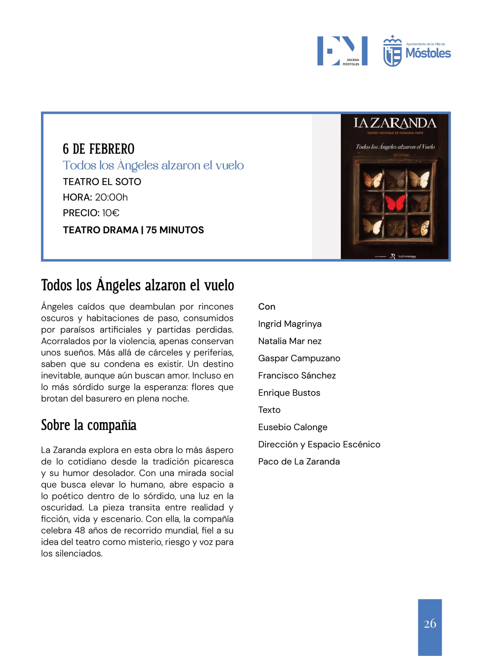 "Todos los ángeles alzaron el vuelo", drama a cargo de la compañía La Zaranda, en el Teatro El Soto a las 20:00 horas. Precio: 10 €. 75 minutos. Para todos los públicos. Venta de entradas online o en taquillas de los teatros municipales.