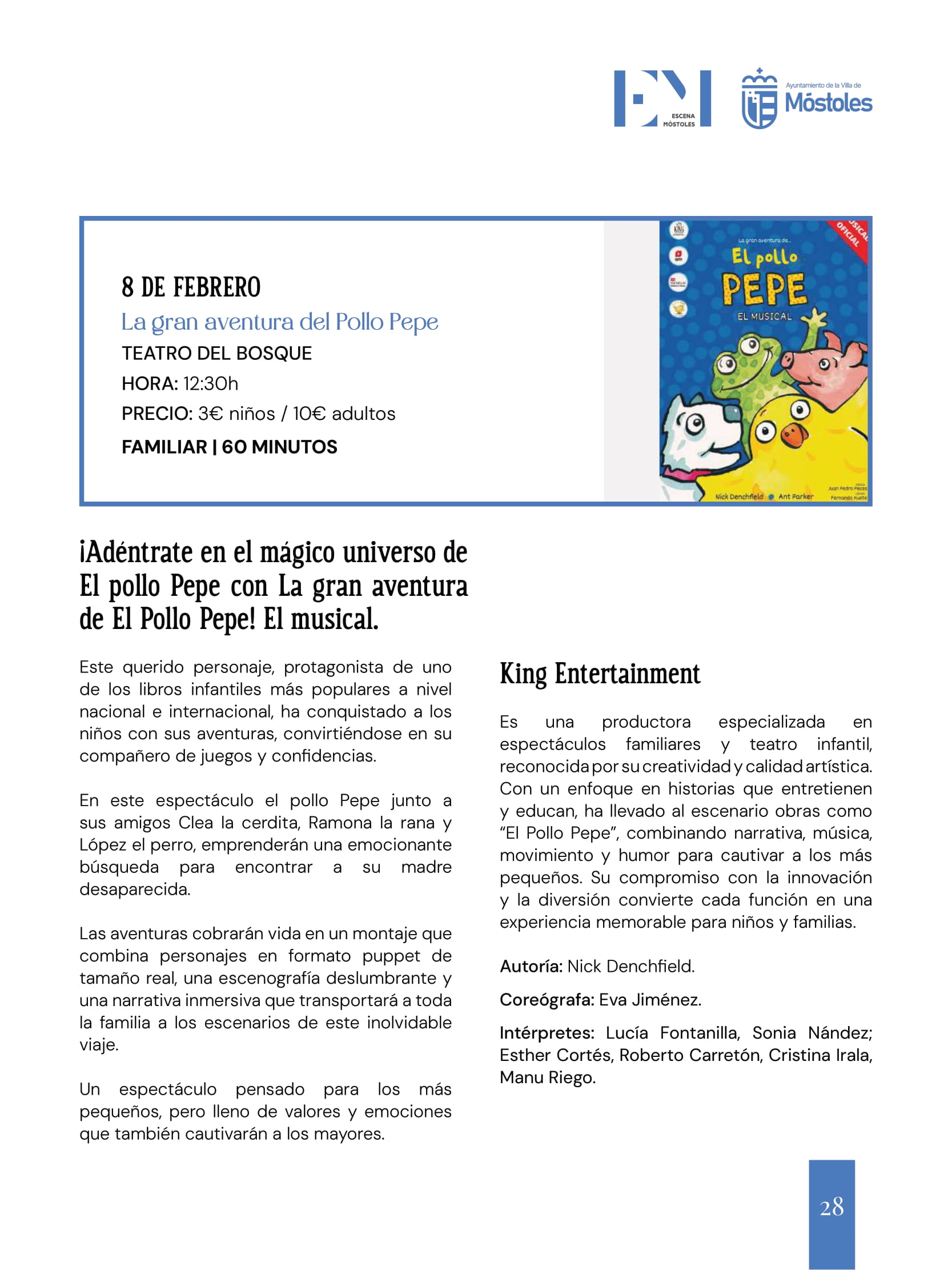 "La gran aventura de El Pollo Pepe! El musical", espectáculo musical a cargo de la productora King Entertainment, en el Teatro del Bosque a las 12:30 horas. Precio: 3 € niños, 10 € adultos. 60 minutos. Para todos los públicos. Venta de entradas online o en taquillas de los teatros municipales.