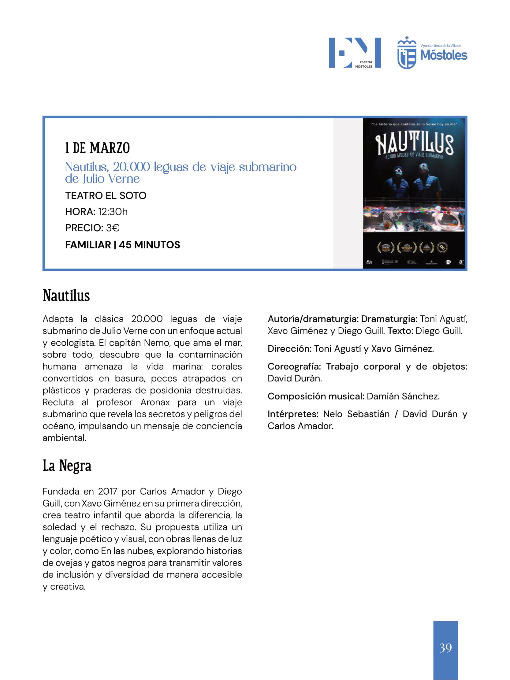 "Nautilus", adaptación del clásico 20.000 leguas de viaje submarino de Julio Verne a cargo de la compañía La Negra, en el Teatro El Soto a las 12:30 horas. Precio: 3 €. 45 minutos. Para todos los públicos. Venta de entradas online o en taquillas de los teatros municipales.