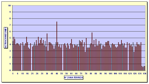 Como decíamos anteriormente, este servicio comenzó a prestarse en diciembre de 2007, y durante los primeros seis meses se ha observado como las actuaciones, en cada una de las zonas de limpieza, han ido aumentando cada mes, llegando a una media de 4 intervenciones por mes en cada zona (ver gráfico).