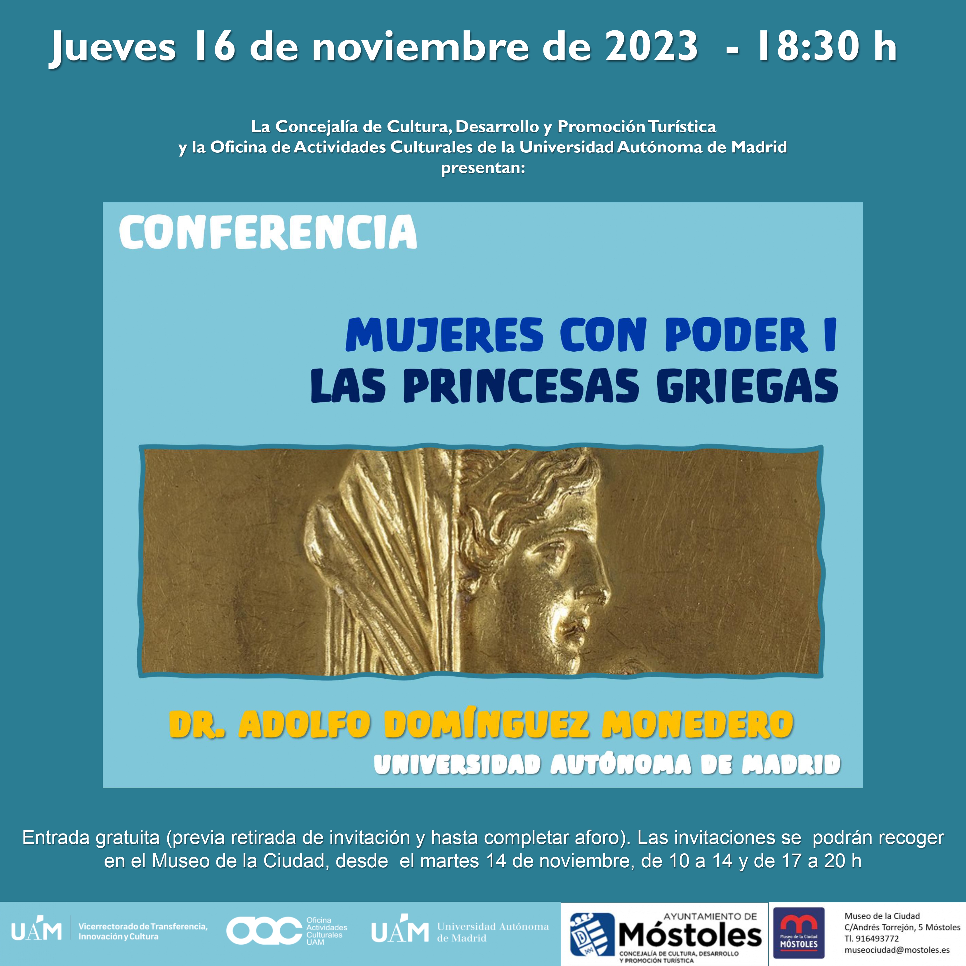 En el Museo de la Ciudad, conferencia "Mujeres con poder I: Las princesas griegas", a cargo del Dr. Adolfo Domínguez Monedero (UAM). Programación del proyecto de la Universidad Autónoma de Madrid: "Ahora me ves: haciendo visibles a las mujeres en la Antigüedad". A las 18:30 h.