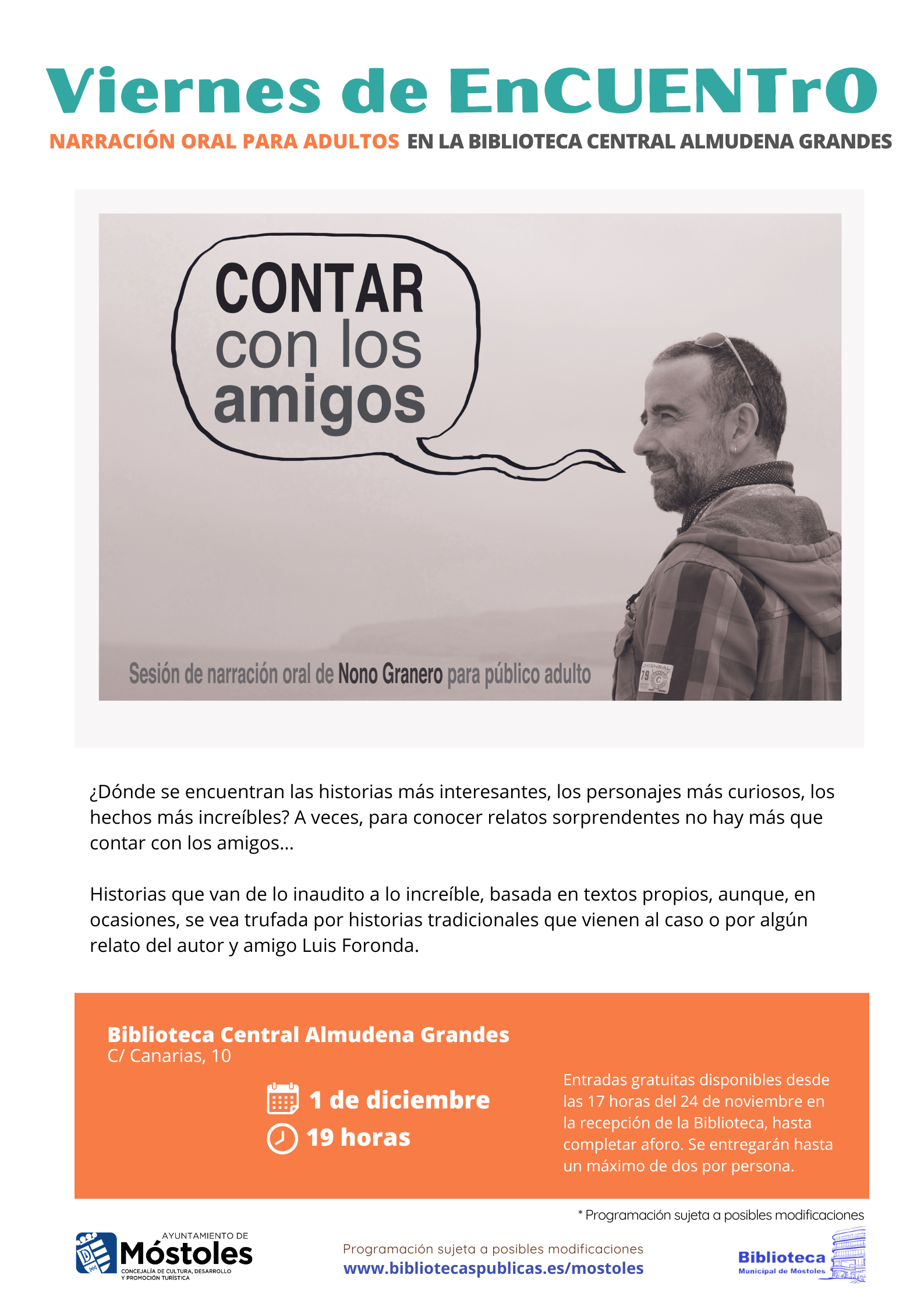 "Contar con los amigos" de Nono Granero. Narración oral para adultos, dentro de la programación de Viernes de Encuentro, a las 19 horas en la Biblioteca Central Almudena Grandes.