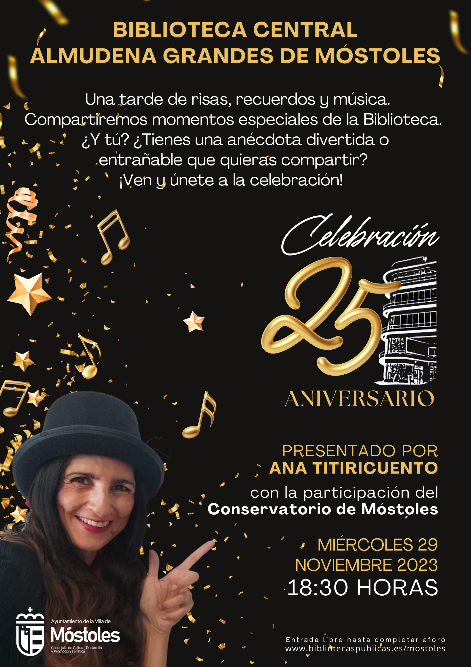 Un acto para todos los públicos donde no faltarán las risas, los recuerdos y la música. Compartiremos momentos especiales de la Biblioteca, anécdotas divertidas y entrañables con usuarios y lectores. Presentado por Ana Titiricuento y con la participación del Conservatorio de Móstoles.