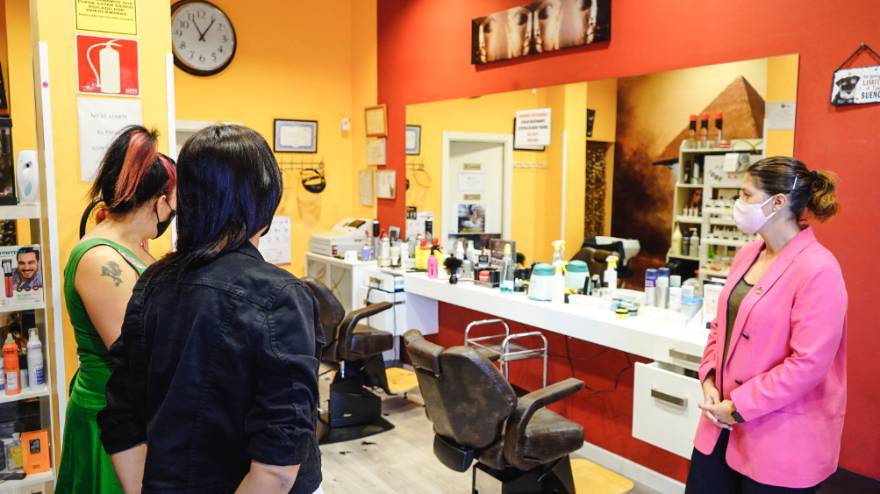 La Alcaldesa de Móstoles, Noelia Posse, visita el establecimiento JL Peluqueros