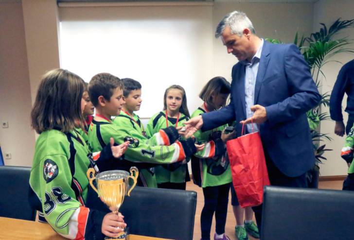Imagen en alta resolución. Este enlace se abrirá mediante lightbox, puede haber un cambio de contextoJóvenes deportistas de las categorías Prebenjamines y Alevines del Club Hockey Ciudad Patina Renos, acompañados por su entrenador, Eugenio Argote. fueron recibidos, ayer lunes 20 de junio, por el alcalde de Móstoles, David Lucas. Durante el encuentro el primer edil felicitó a los jóvenes por los logros conseguidos durante la temporada 2015-2016, en la que el equipo de Prebenjamín se clasificó en el segundo lugar de la Comunidad de Madrid y el Alevín en el tercero.