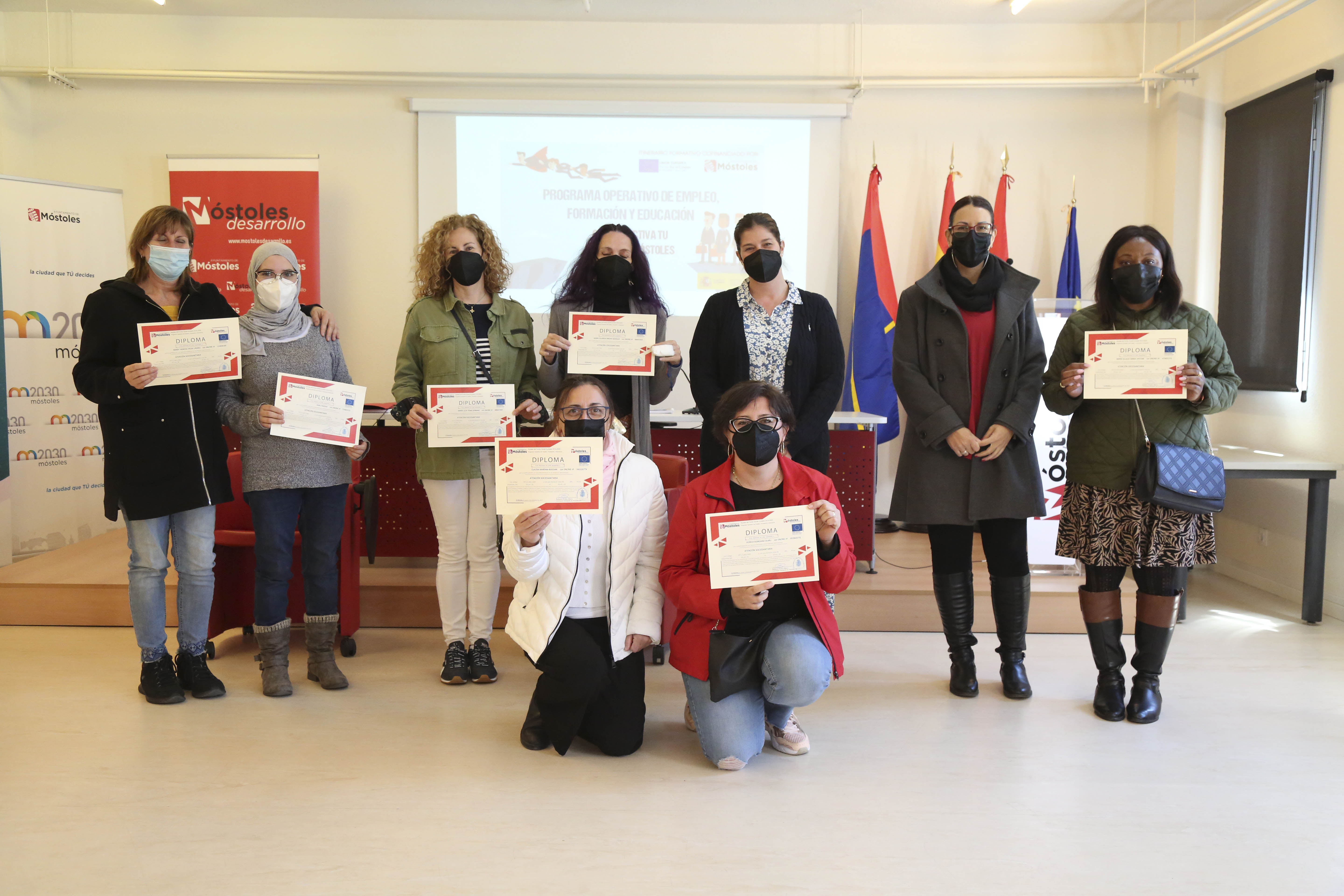 La Alcaldesa de Móstoles, Noelia Posse, junto a la Concejala de Presidencia, Rebeca Prieto, ha hecho entrega de los diplomas a las personas que han participado en este programa, que está cofinanciado por el Ayuntamiento de Móstoles y el Fondo Social Europeo al 50 % a través de la Dirección General de Relaciones con las Comunidades Autónomas y Entes Locales, de acuerdo con el Programa Operativo de Empleo, Formación y Educación (POEFE).