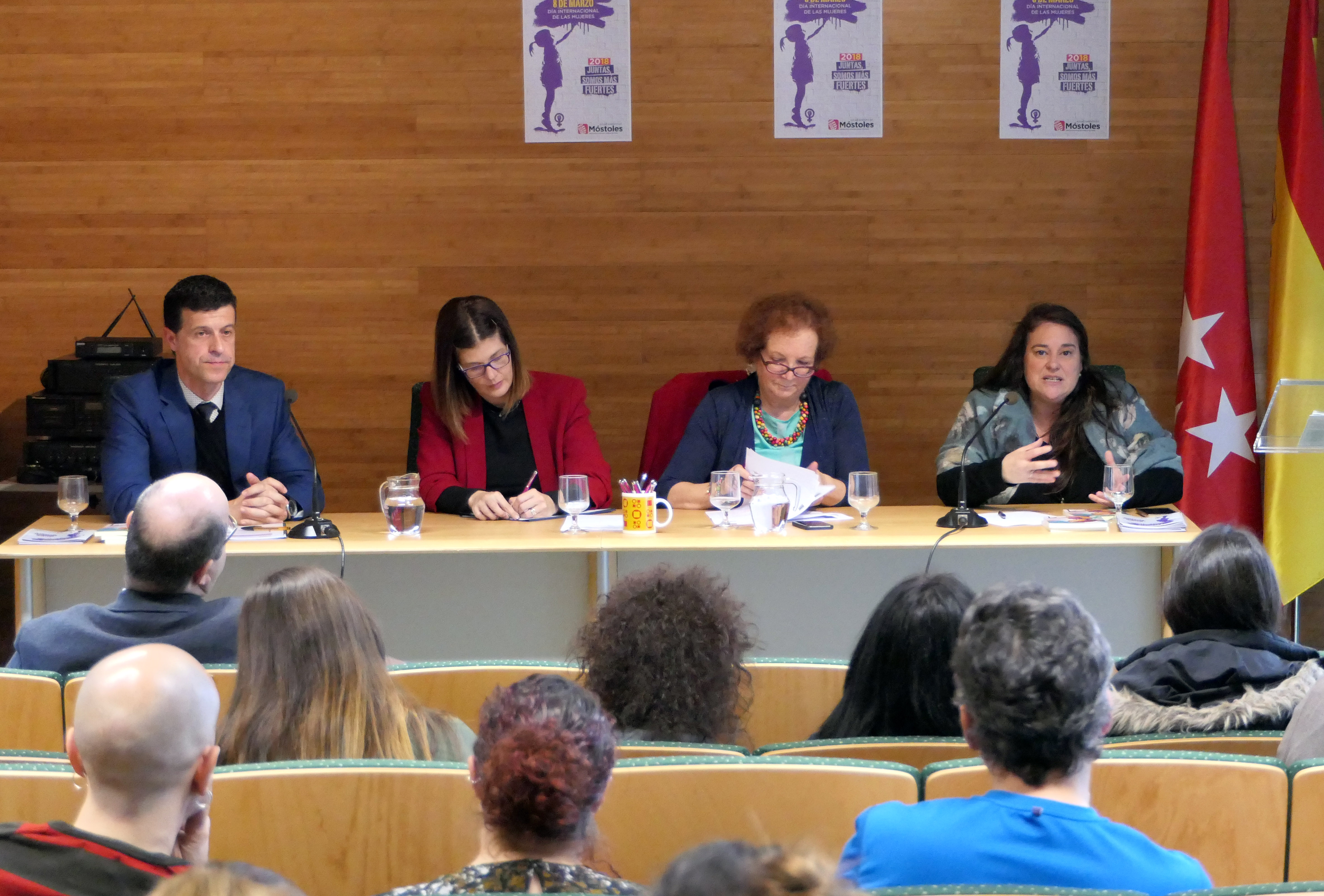 La alcaldesa de Móstoles, Noelia Posse, junto a la concejala de Igualdad, Sanidad y Mayores, Ana María Rodrigo, el director general de la Asociación Punto Omega, David Barriopedro y la coordinadora del programa SPANT, Silvia Allué, ha presentado esta mañana el Servicio de Prevención de la Adicción de los Centros Educativos de Móstoles.