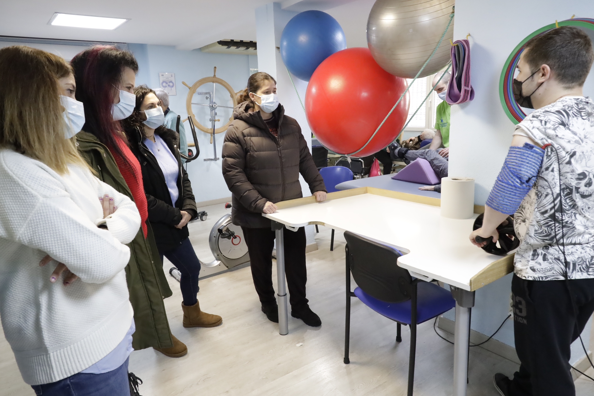 Acompañada de la Concejala de Derechos Sociales y Mayores, Ángela Viedma, la Portavoz de Podemos, Mónica Monterreal, el Presidente de ADISFIM, Juan Carlos Arias, su Directora, Esther Rubio, y la Secretaria de la asociación, Cristina García, la Primera Edil se ha interesado por la labor que desempeñan los profesionales ayudando a recuperar la movilidad de las personas que asisten a los talleres.