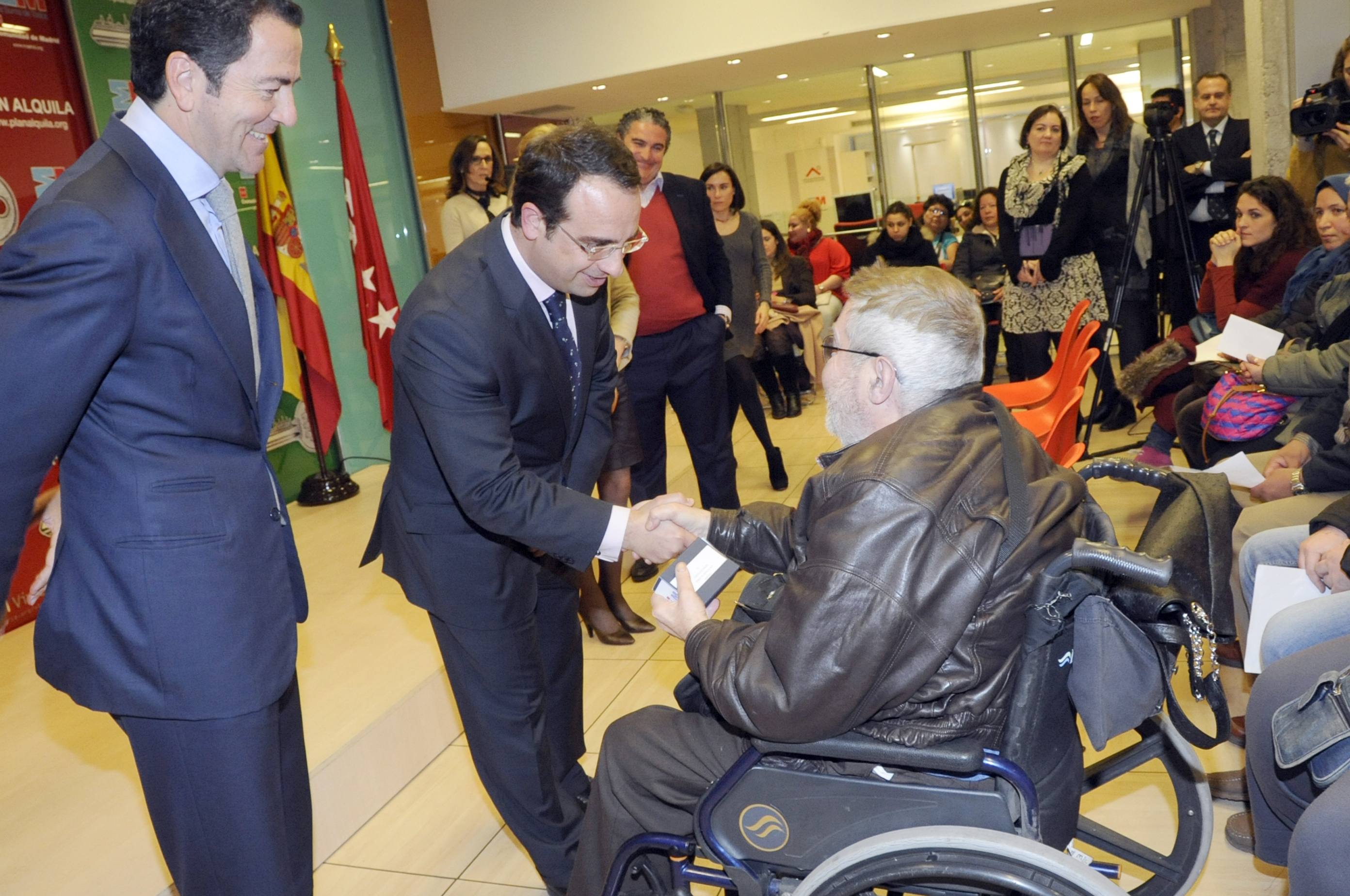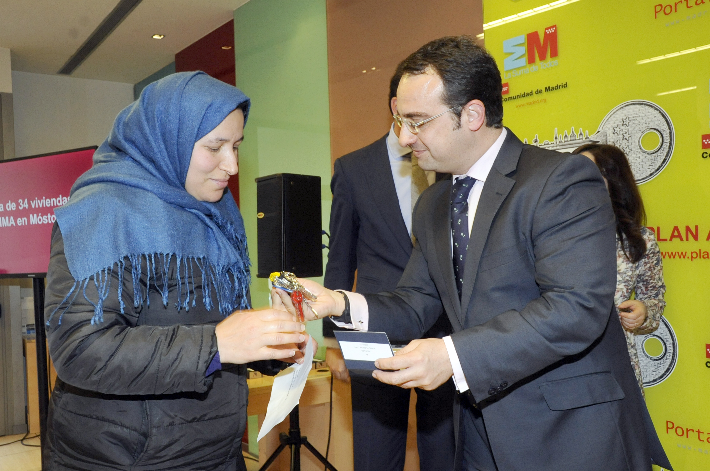 El Consejero de Transportes, Infraestructuras y Vivienda de la Comunidad de Madrid, Pablo Cavero, y el Alcalde de Móstoles, Daniel Ortiz, han entregado las llaves de 34 viviendas de promoción pública de alquiler, en su mayoría, destinadas a familias con escasos recursos.