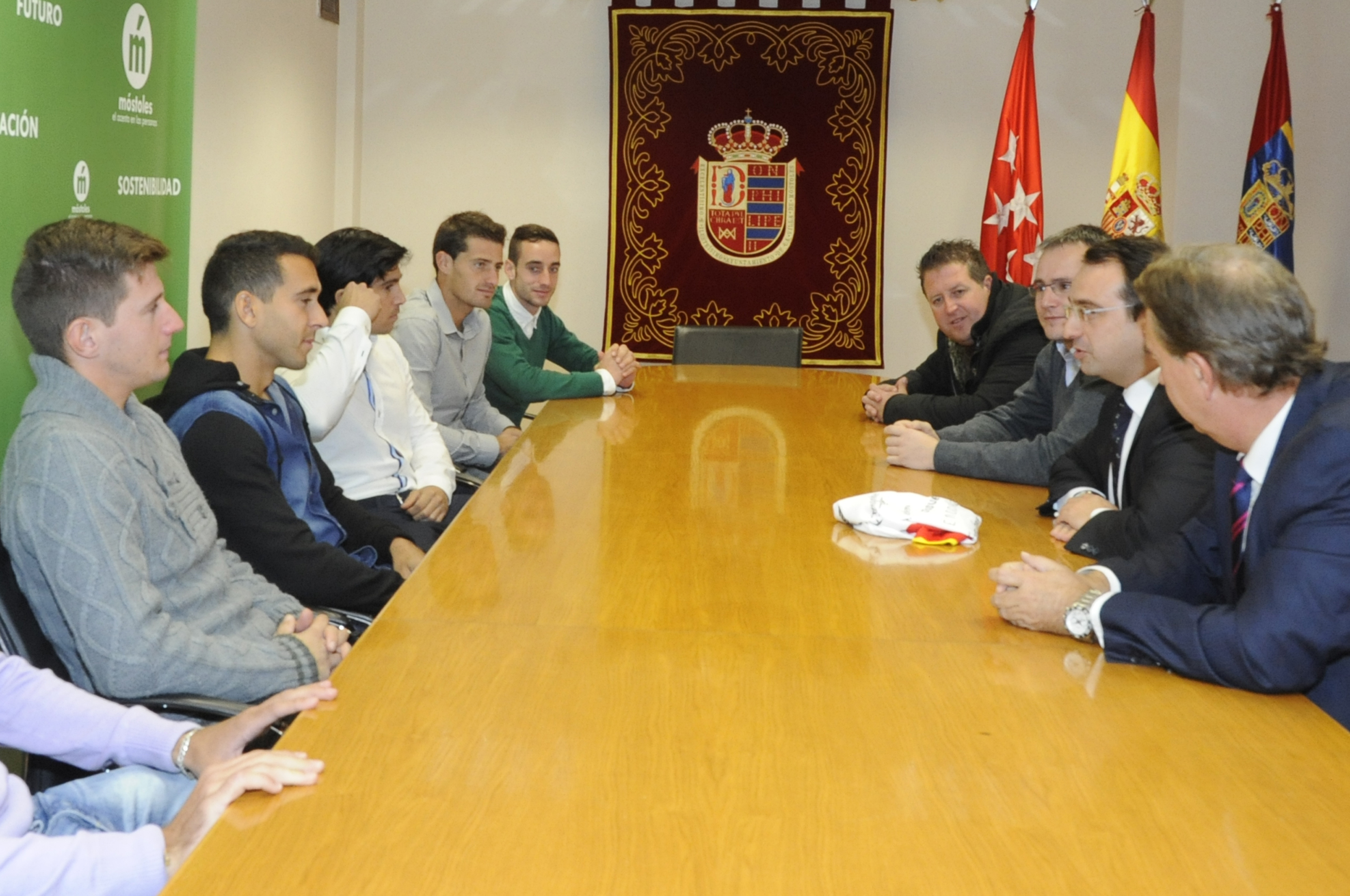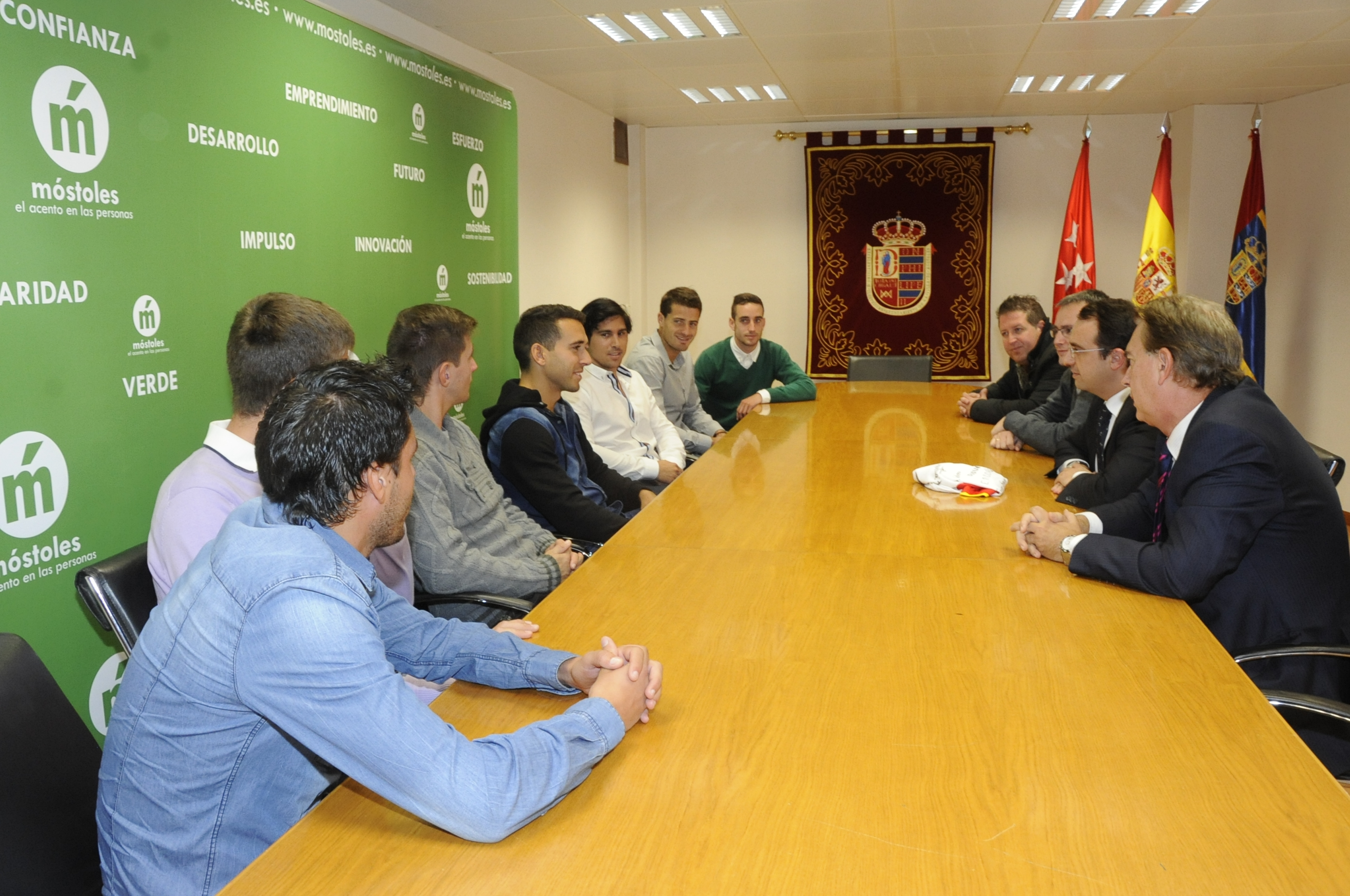 El Alcalde de Móstoles, Daniel Ortiz, junto al Concejal de Deportes y Juventud, Francisco Vargas, ha recibido esta mañana al Presidente del Club Deportivo Móstoles Tenis, Enrique Santoni y a varios miembros del Club que jugarán mañana a las 14 horas la final del Campeonato de Madrid por equipos absolutos en el Club de Tenis Chamartín.